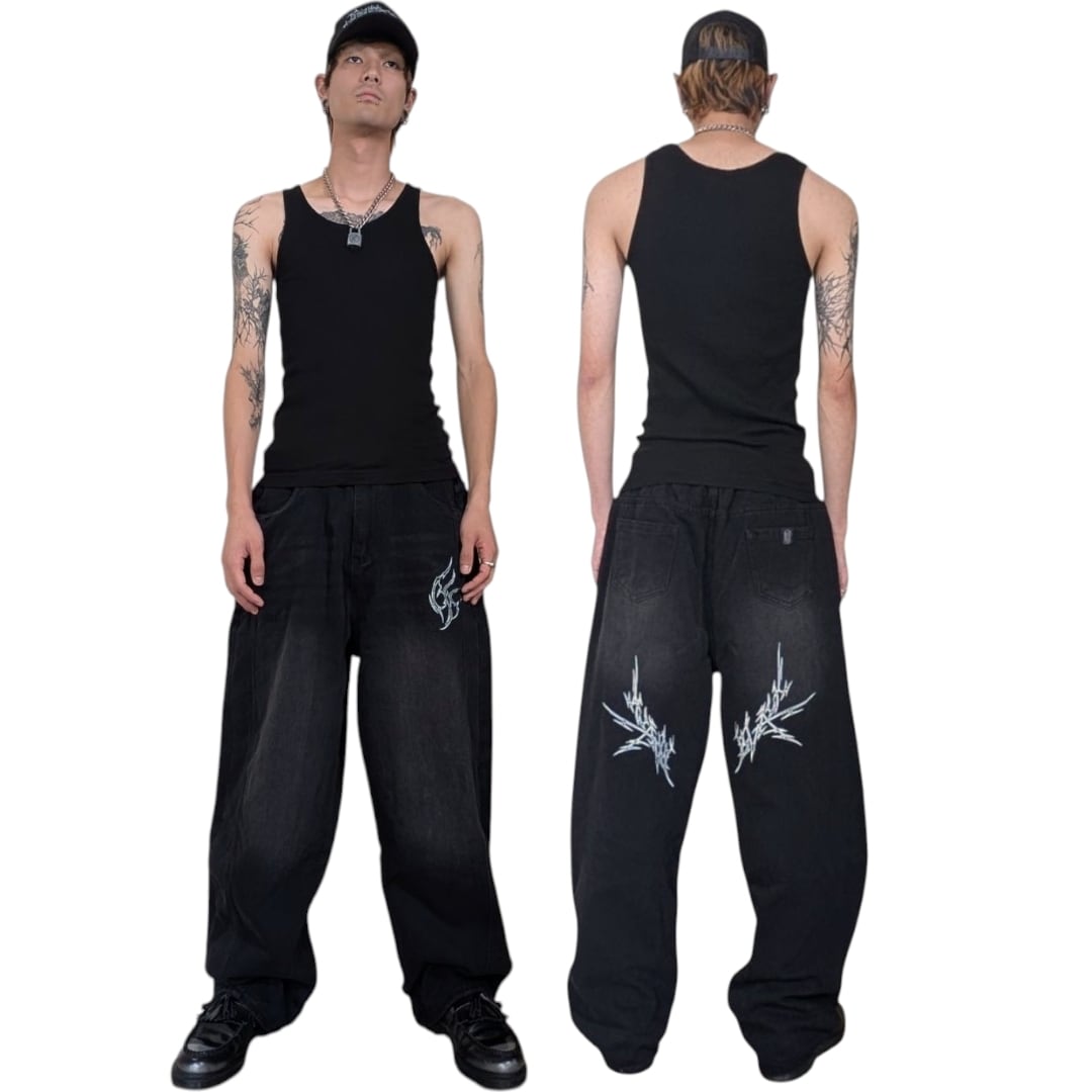生地の表面にはビンテージ加工&ハンドメイドシルクスクリーンを施しました。フロント1箇所とバック2箇所のオリジナルトライバルグラフィックは、よく見るとそれぞれ“BBC”、“Black”、“Brain”の文字で成立しています。