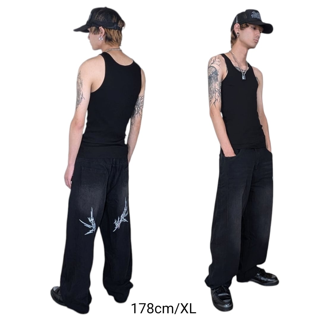 太めのシルエットのブラックジーンズです。