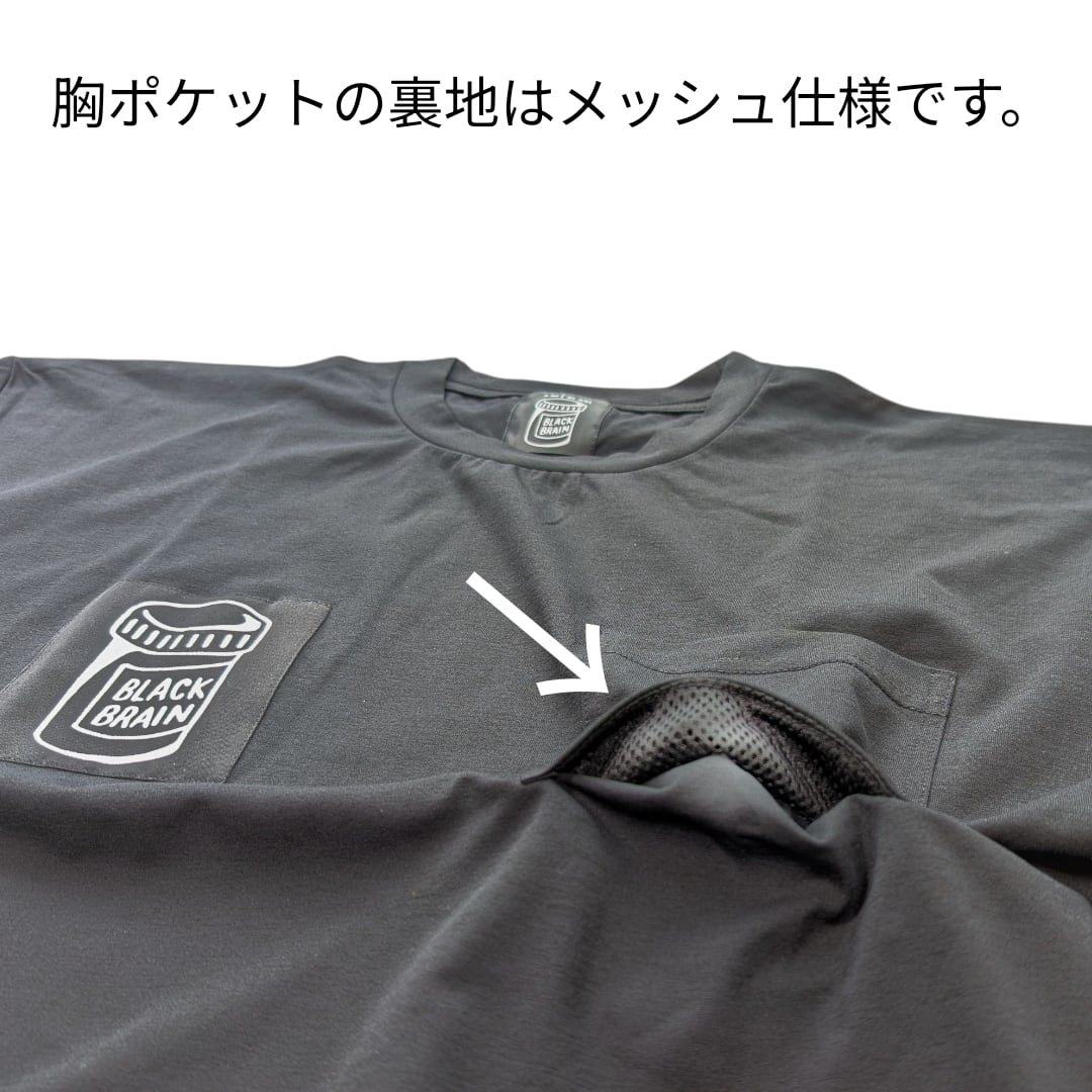 左胸に装備されたスタイリッシュなボックス型ポケットの内側はメッシュ仕様になっています、涼しく、海や川などでのな着用もオススメです。右胸には大きくBLACK BRAINロゴを配置しています。