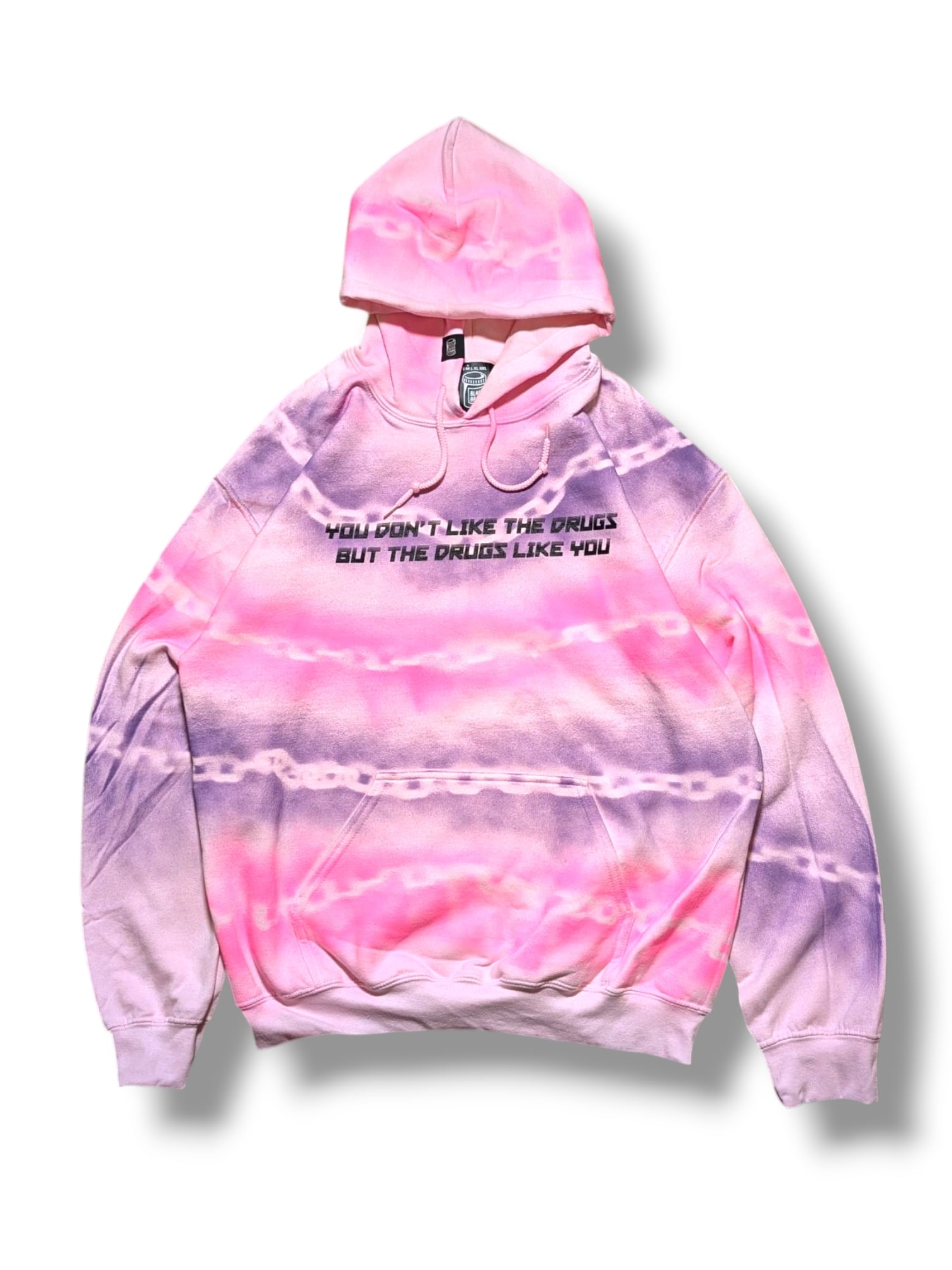 Hoodie全体にチェーンとスプレー塗料を使いステンシルのような加工を施しました。まったく同じものは2枚とありません。すべて一点ものです。胸には“You Don't Like〜”のBLACK BRAINスローガンを手作業で印刷しています。