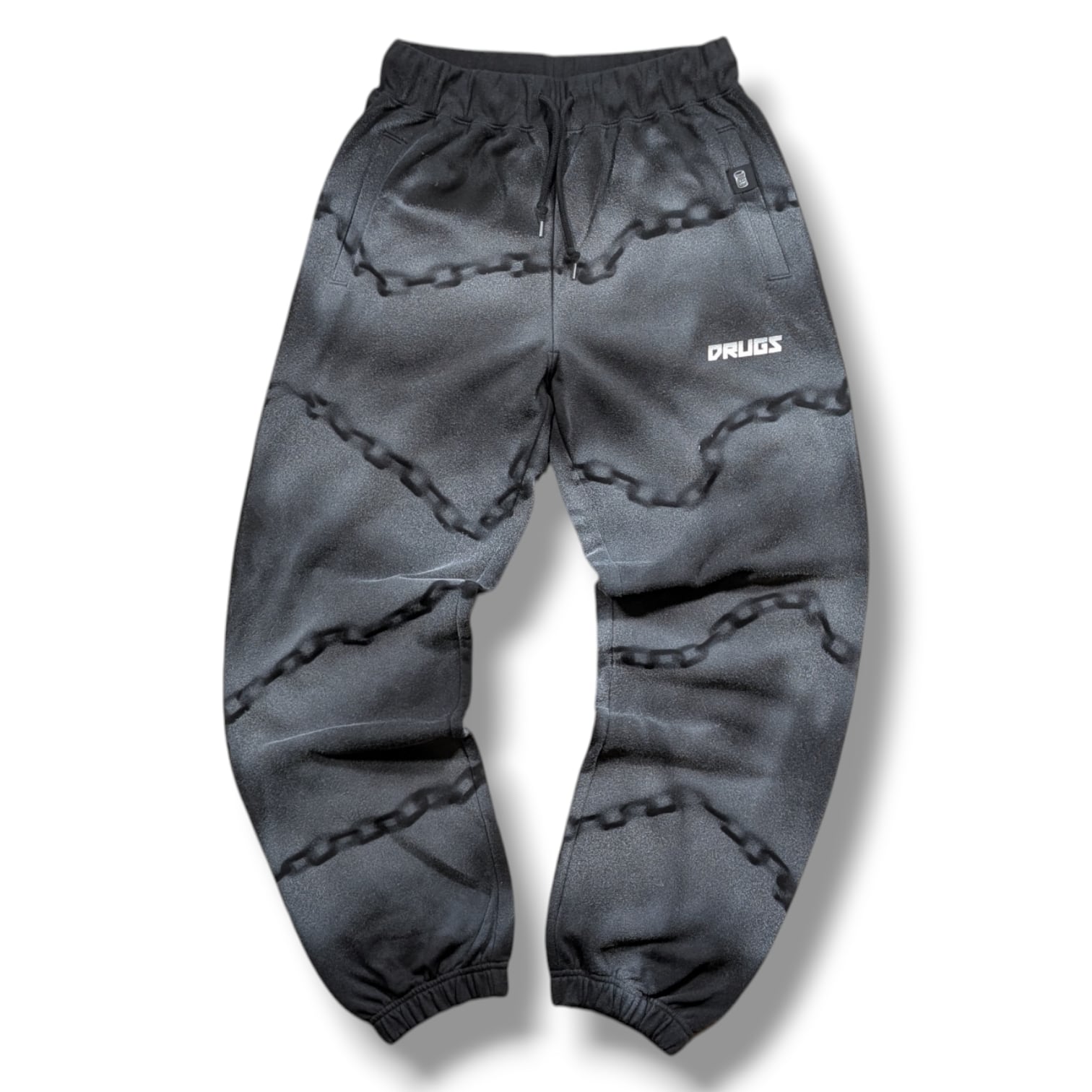 ジョガーパンツ全体にチェーンとスプレー塗料を使いステンシルのような加工を施しました。まったく同じものは2枚とありません。すべて一点ものです。左足にはワンポイントで“Dru//gs”をシルクスクリーン印刷。