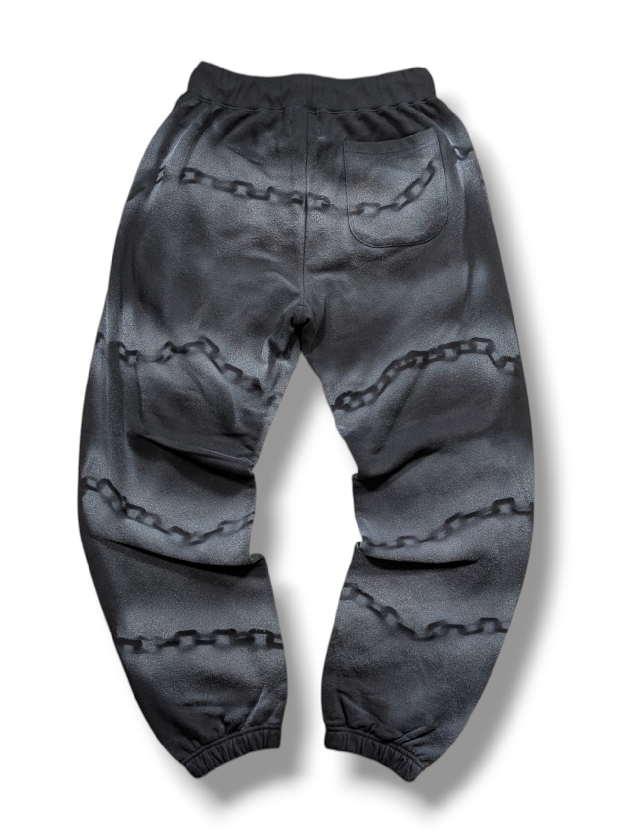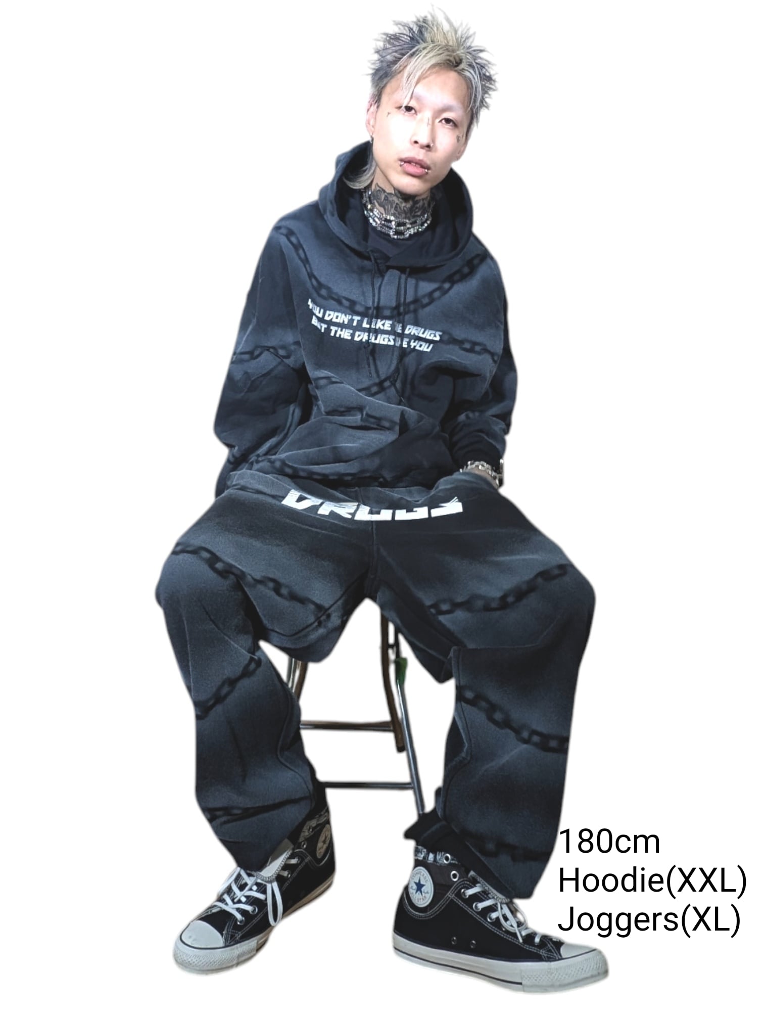 ジョガーパンツ全体にチェーンとスプレー塗料を使いステンシルのような加工を施しました。まったく同じものは2枚とありません。すべて一点ものです。左足にはワンポイントで“Dru//gs”をシルクスクリーン印刷。
