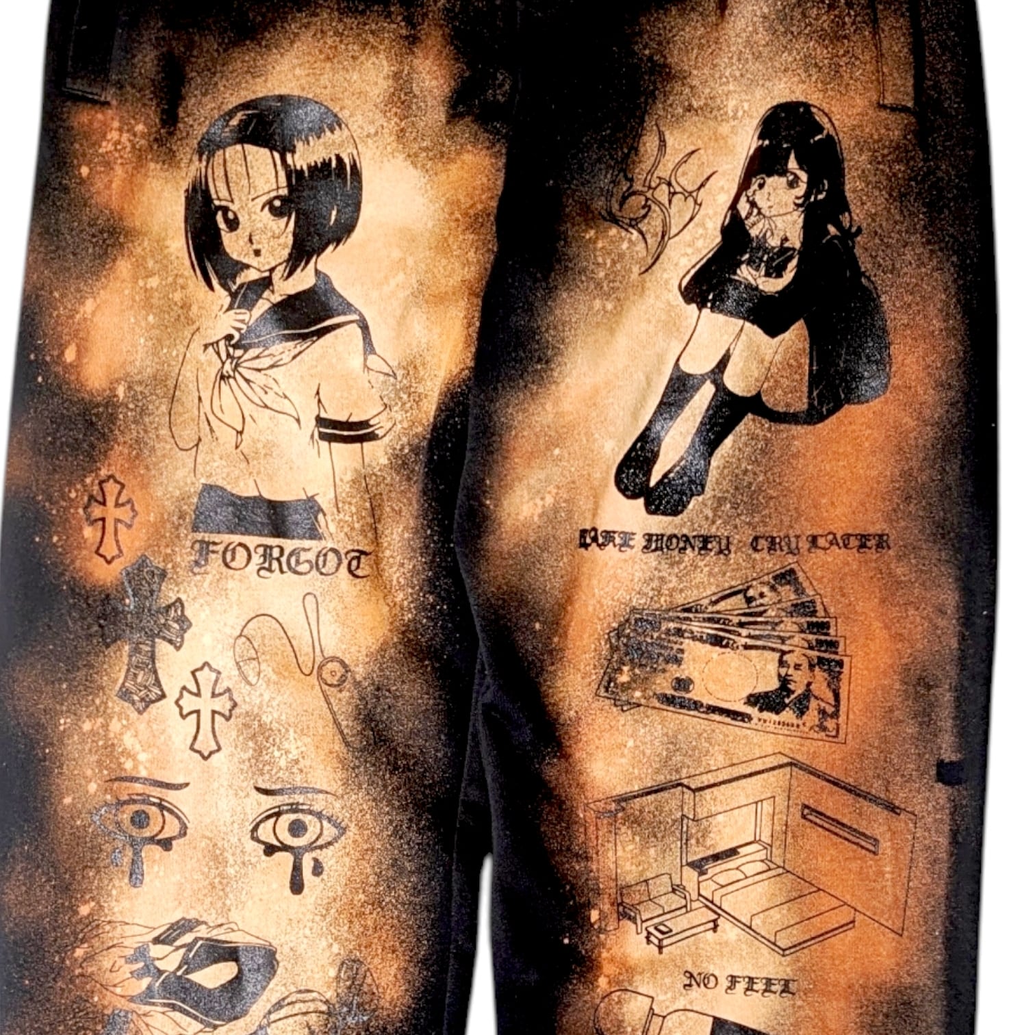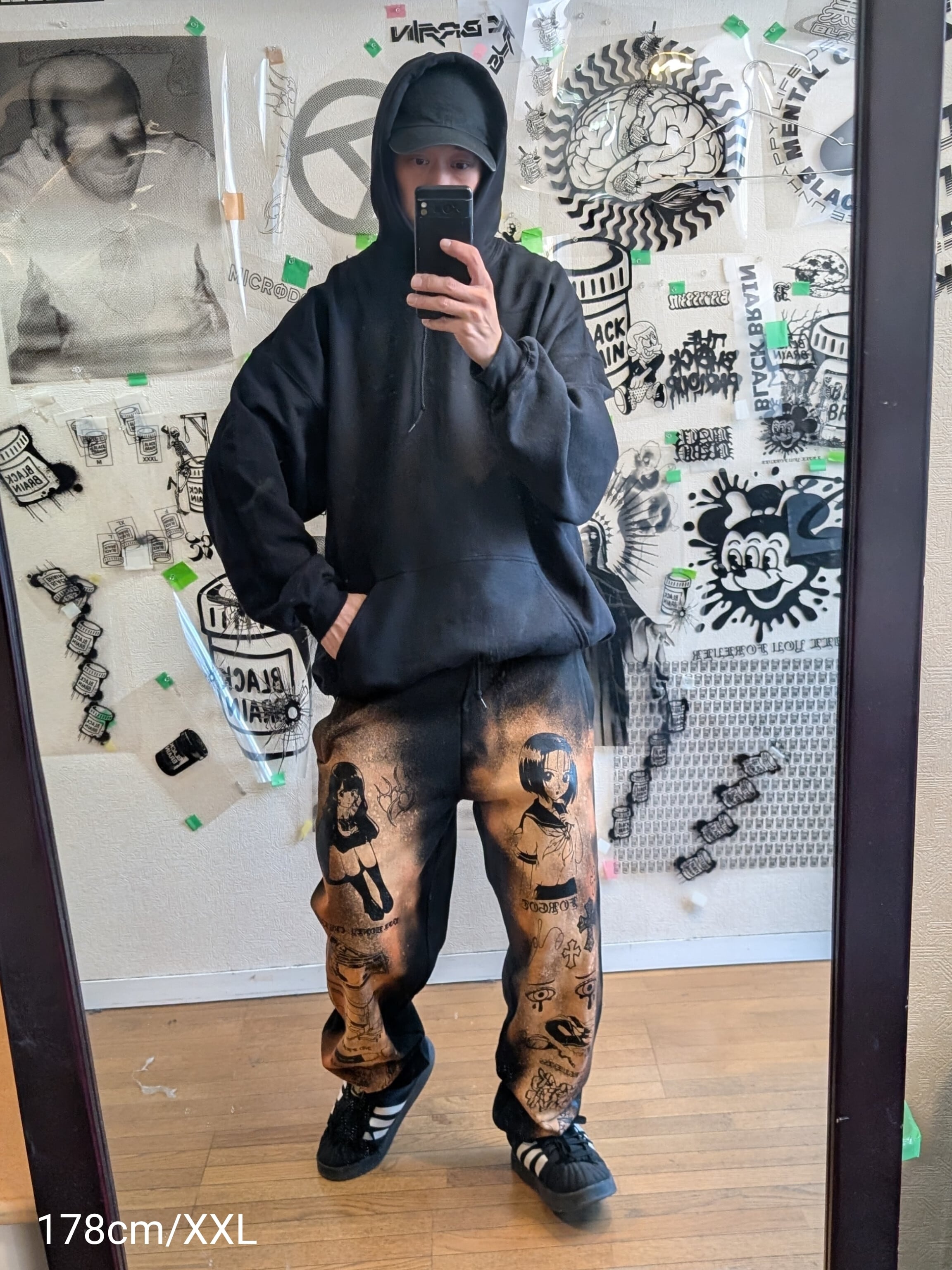 ジョガーパンツを漂白剤でブリーチアウトし、その部分に上からPKグラフィックをシルクスクリーンプリントしました。かなり手間のかかる商品ですが雰囲気のある1枚に仕上がっています。めちゃくちゃサブカルっぽいアイテムになりますが、P-Katsuモチーフのパンツなんて他では見ることがないと思いますし、変わったものが好きな方には自信を持ってお勧めできる商品です。