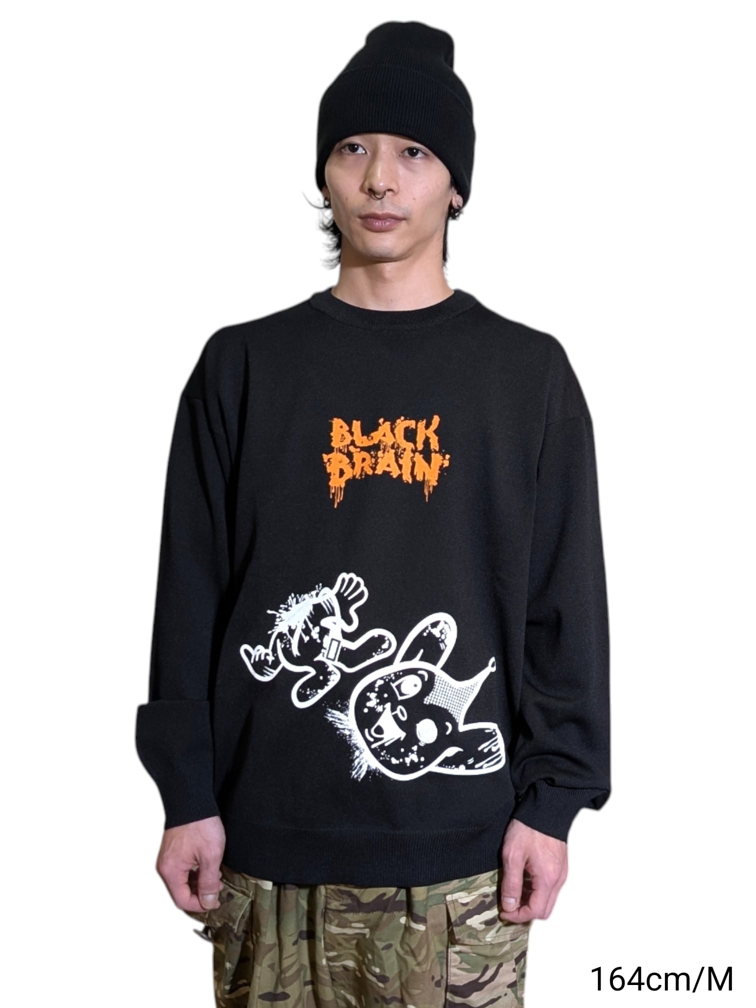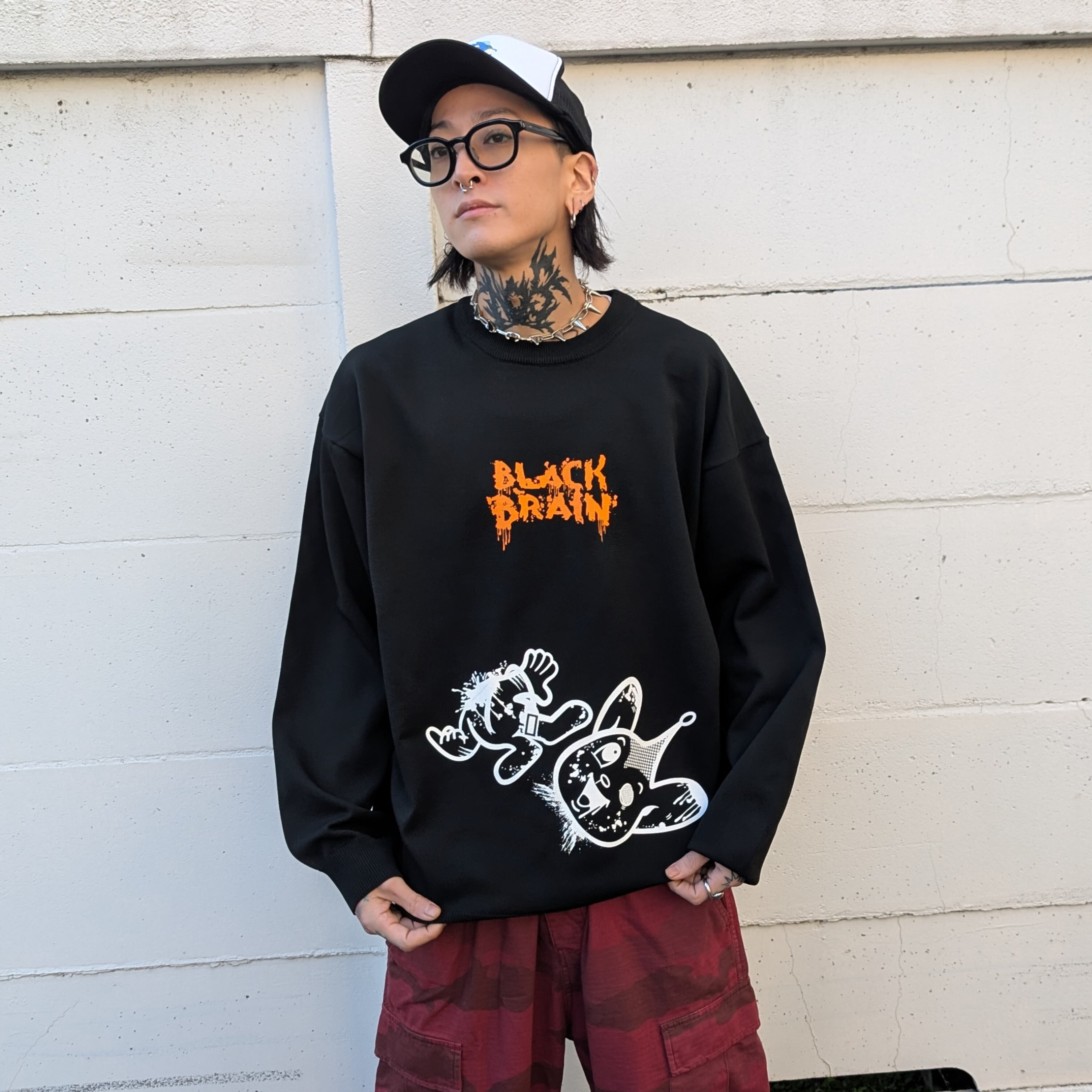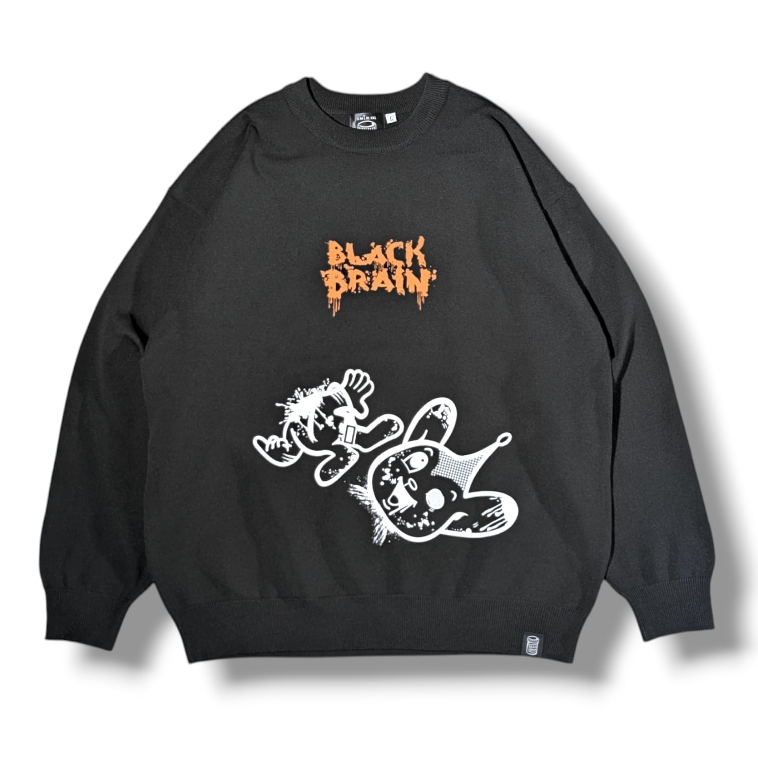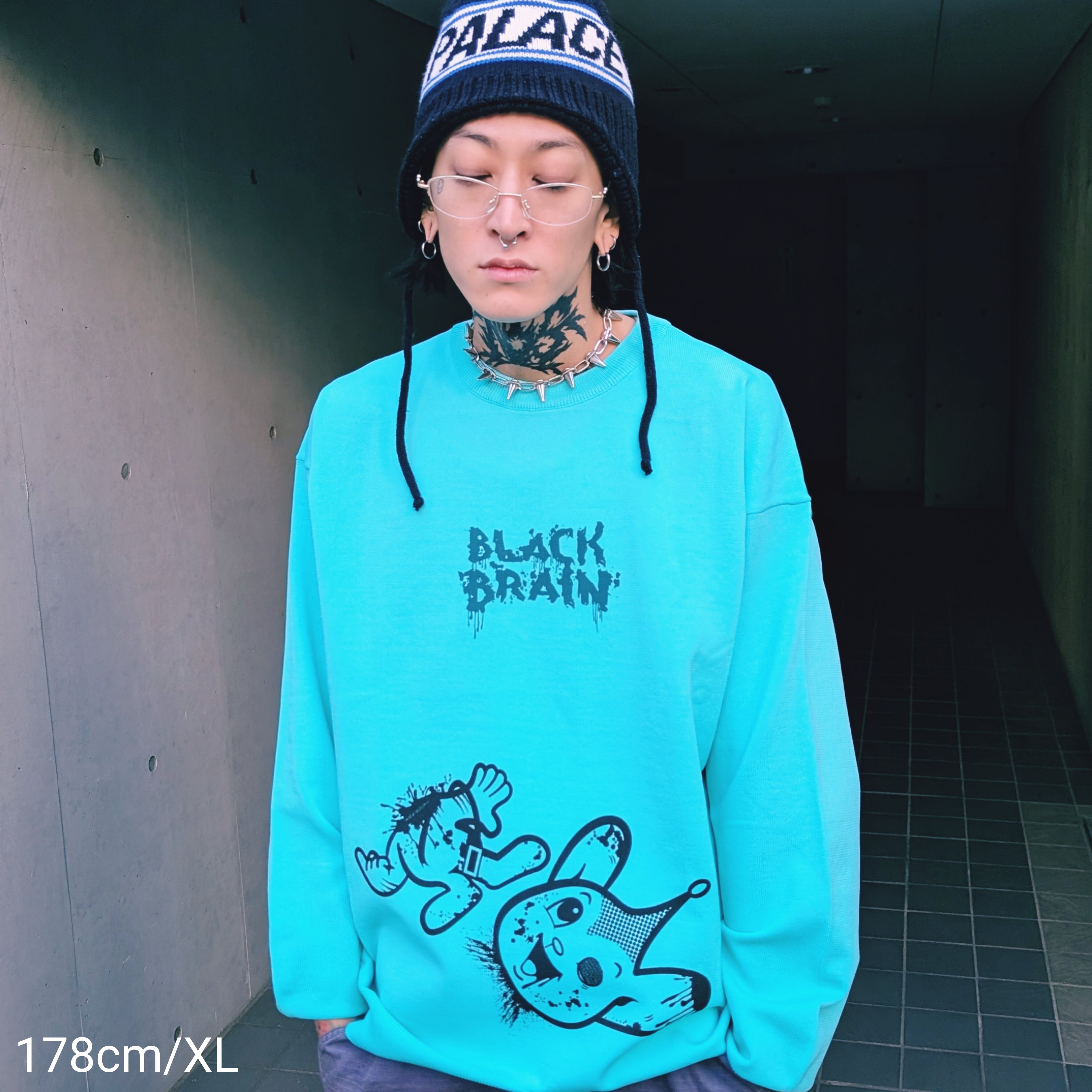 BLACK BRAINではかなり珍しいニット素材のセーターです(いつもはスウェット素材多いので)。ボディに伸縮性があるためプリントも伸縮性のある塗料で行う必要がありますがとても綺麗に仕上がっています。プリントはハンドメイドで行われていますが、ムラなくすべての製品の仕上がりが美しいです。