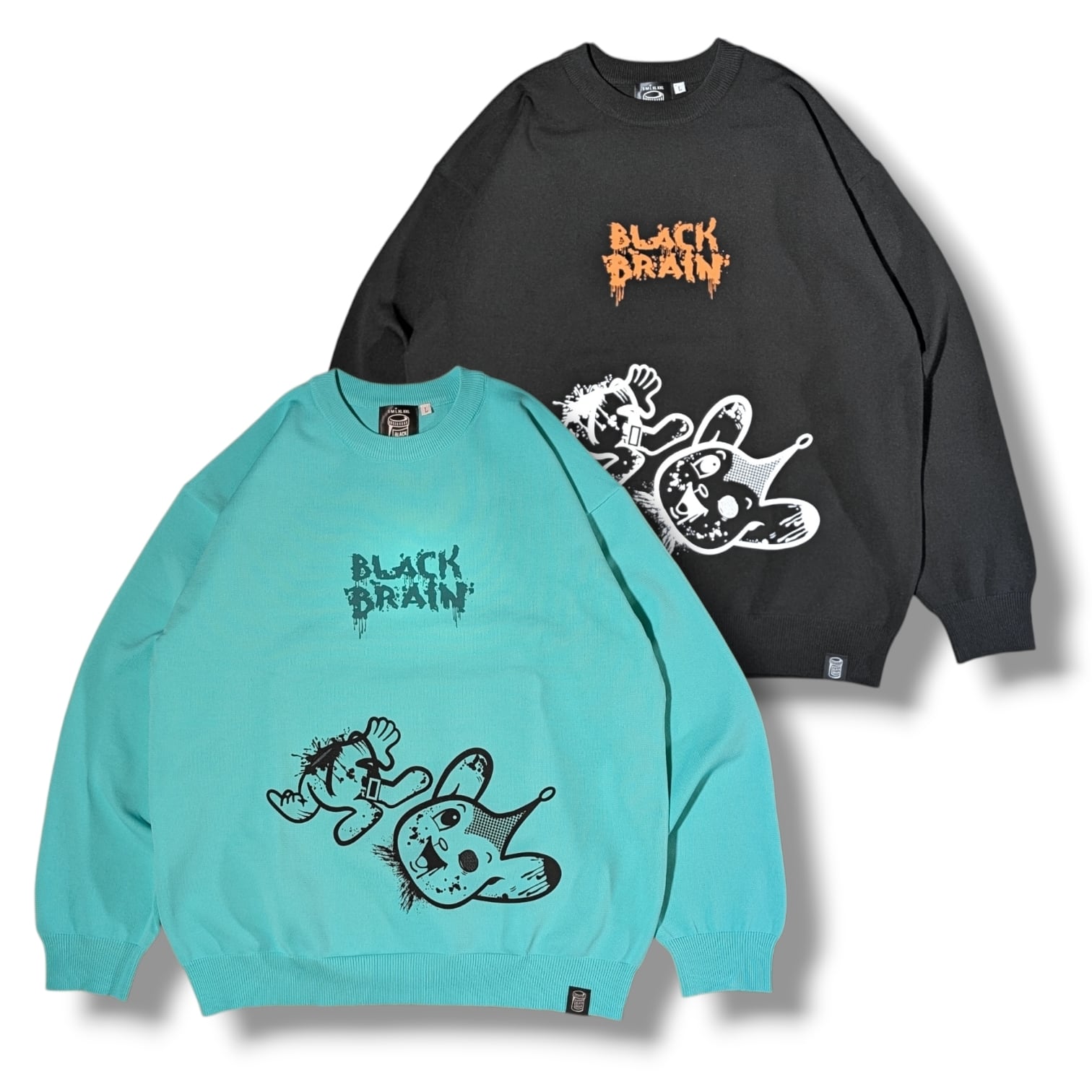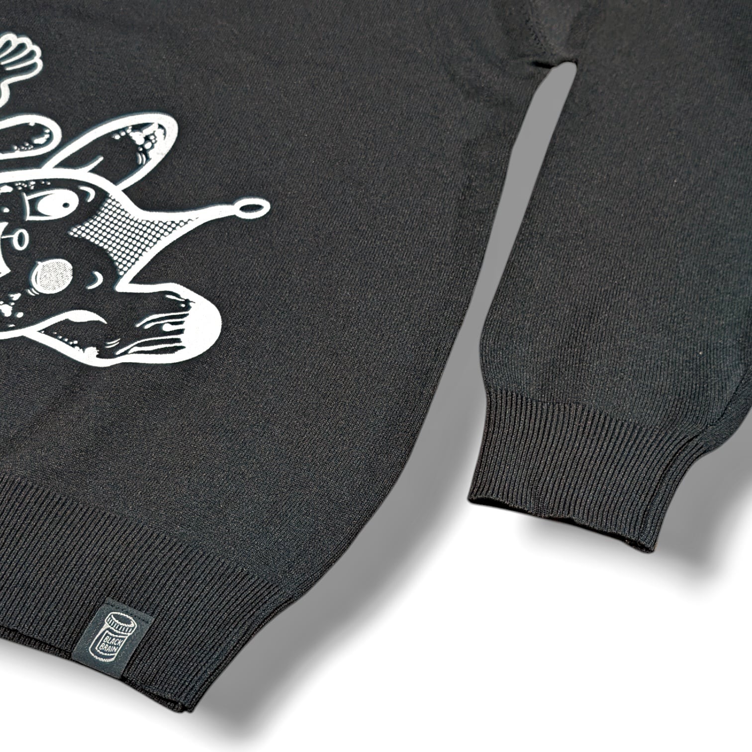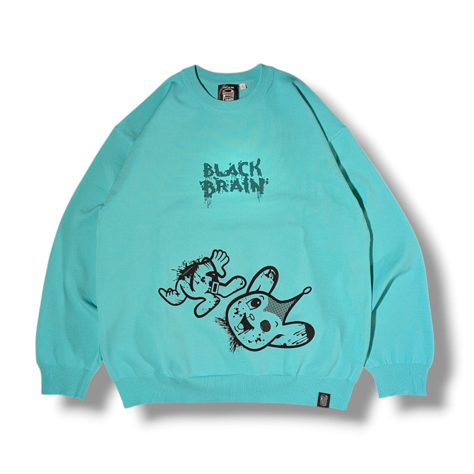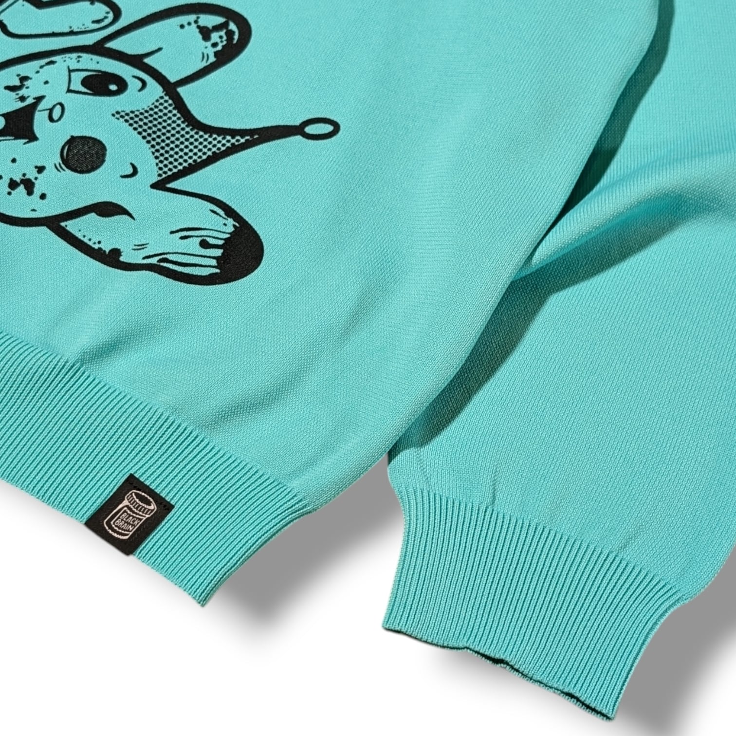 BLACK BRAINではかなり珍しいニット素材のセーターです(いつもはスウェット素材多いので)。ボディに伸縮性があるためプリントも伸縮性のある塗料で行う必要がありますがとても綺麗に仕上がっています。プリントはハンドメイドで行われていますが、ムラなくすべての製品の仕上がりが美しいです。
