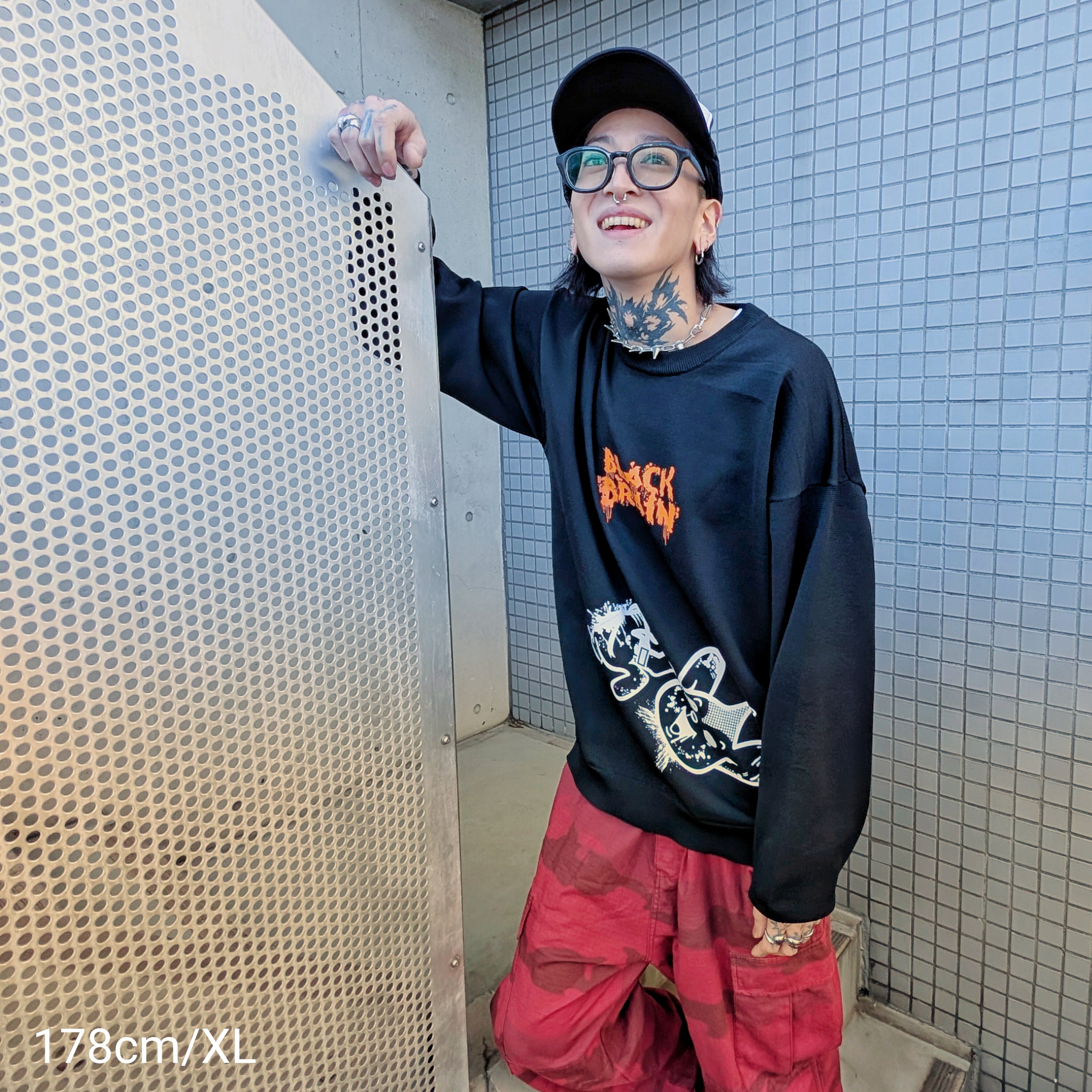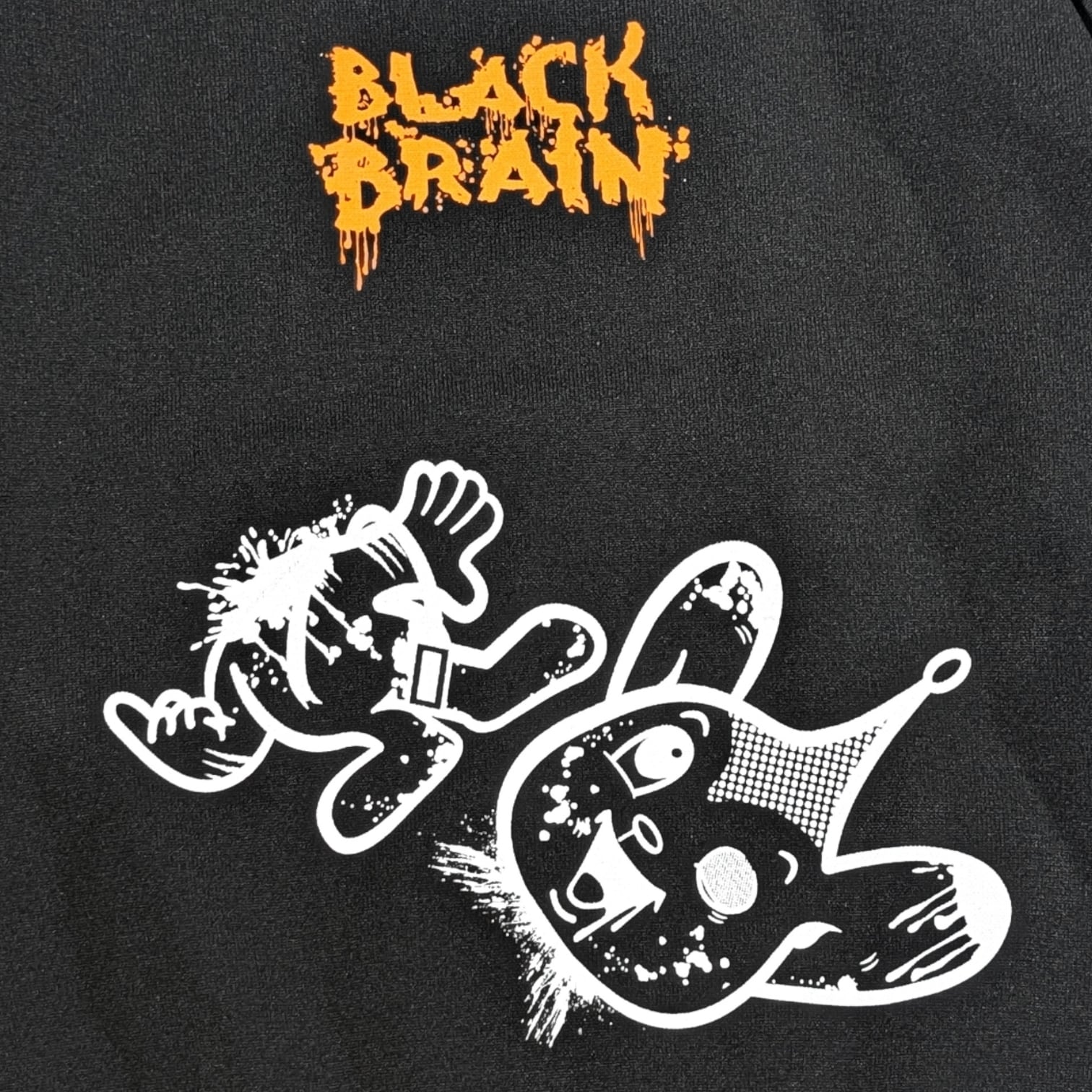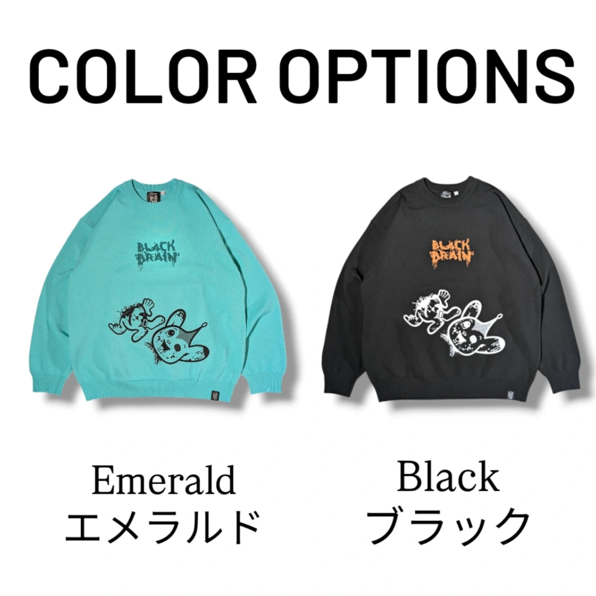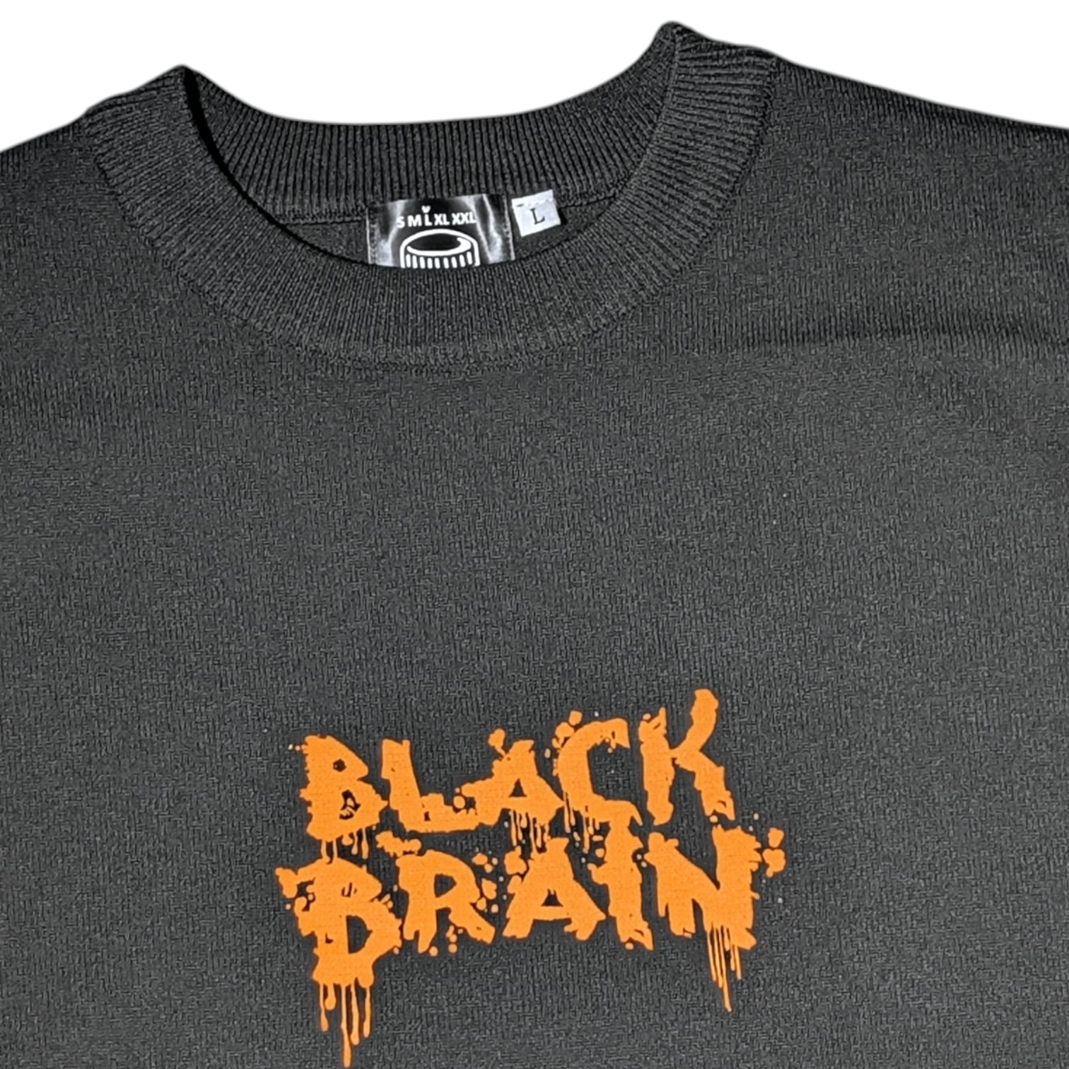 BLACK BRAINではかなり珍しいニット素材のセーターです(いつもはスウェット素材多いので)。ボディに伸縮性があるためプリントも伸縮性のある塗料で行う必要がありますがとても綺麗に仕上がっています。プリントはハンドメイドで行われていますが、ムラなくすべての製品の仕上がりが美しいです。