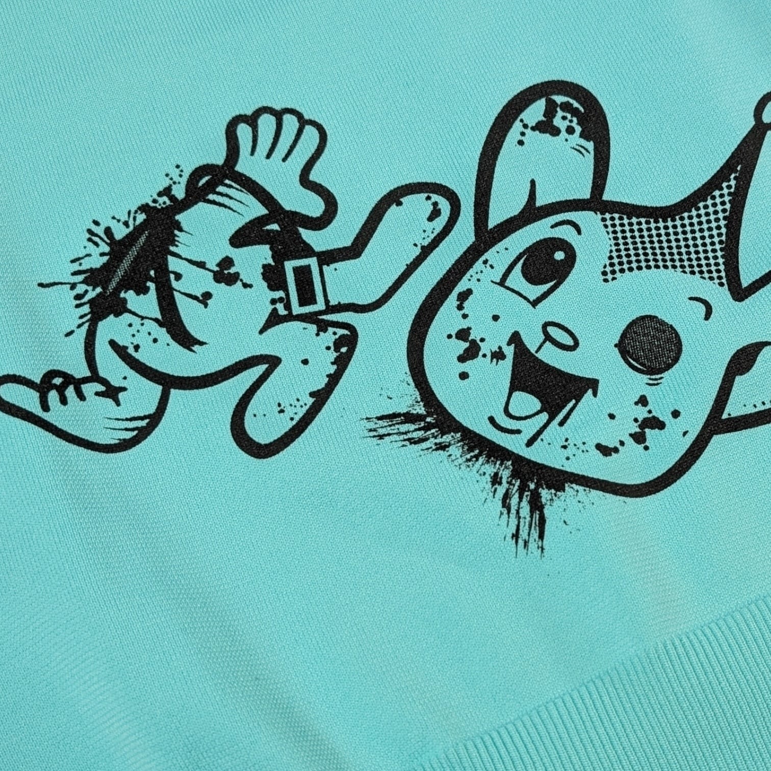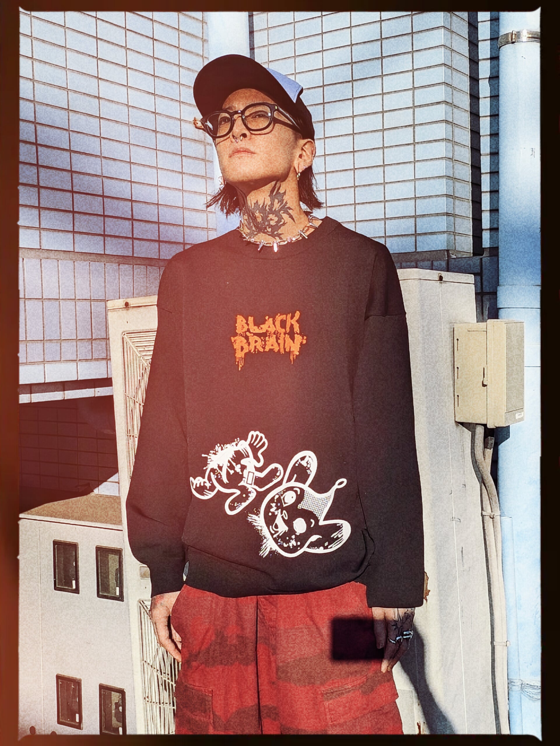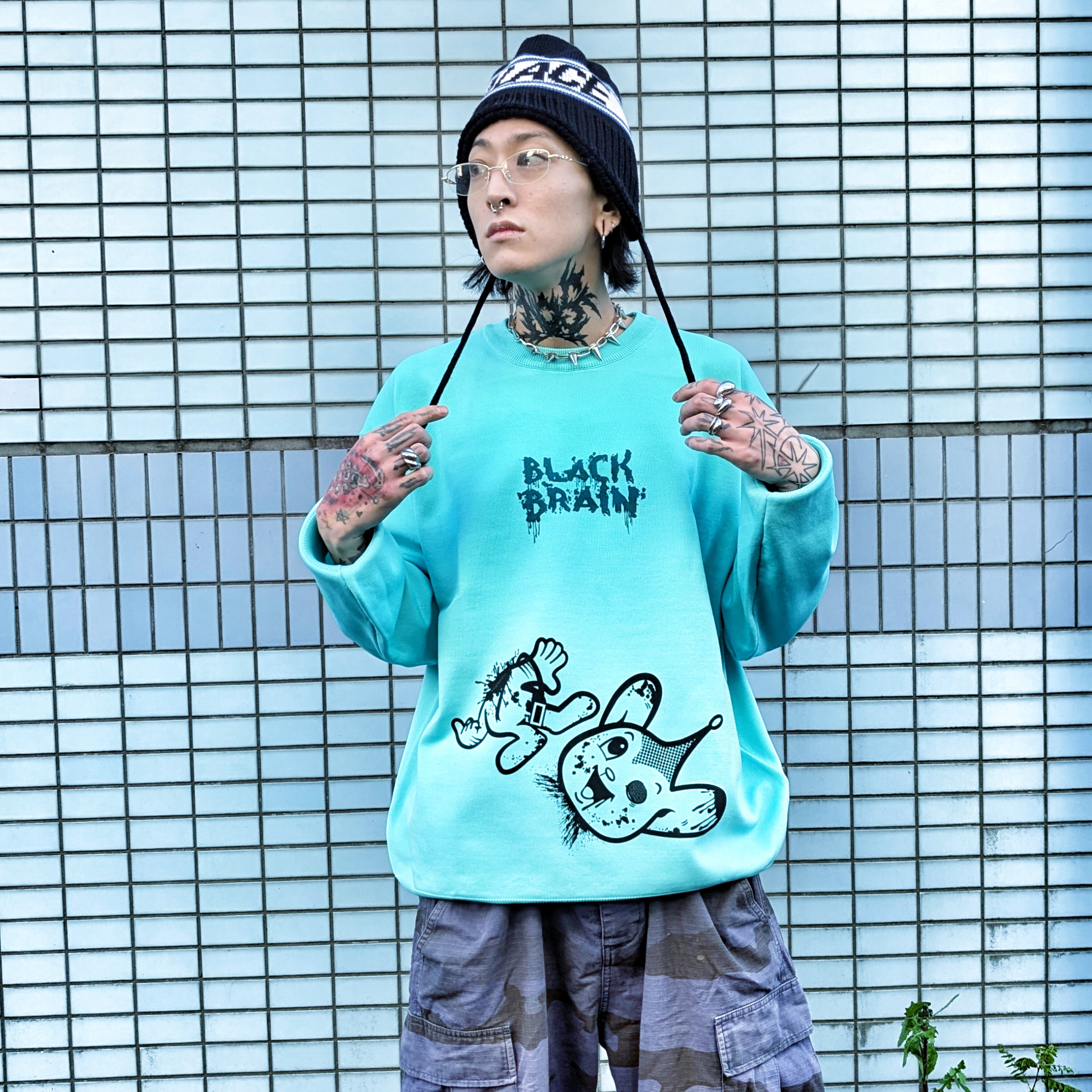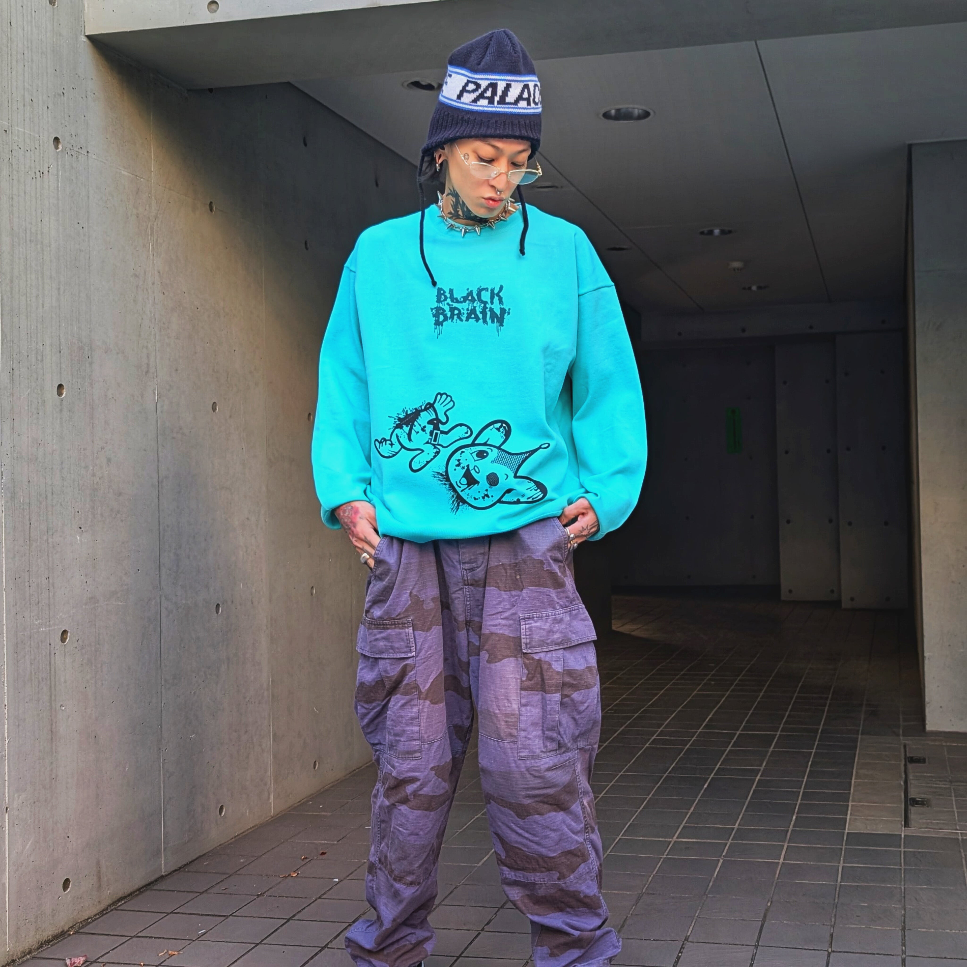 BLACK BRAINではかなり珍しいニット素材のセーターです(いつもはスウェット素材多いので)。ボディに伸縮性があるためプリントも伸縮性のある塗料で行う必要がありますがとても綺麗に仕上がっています。プリントはハンドメイドで行われていますが、ムラなくすべての製品の仕上がりが美しいです。