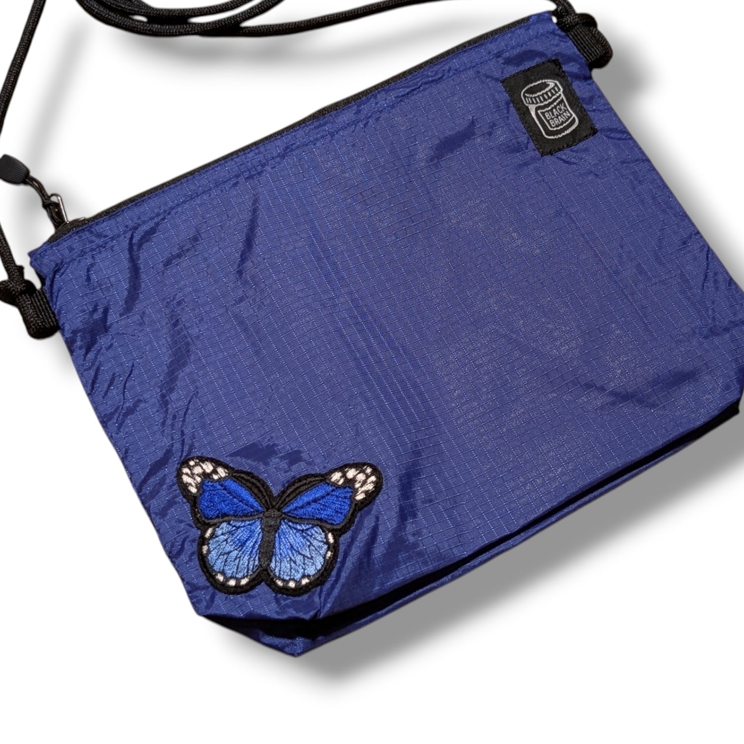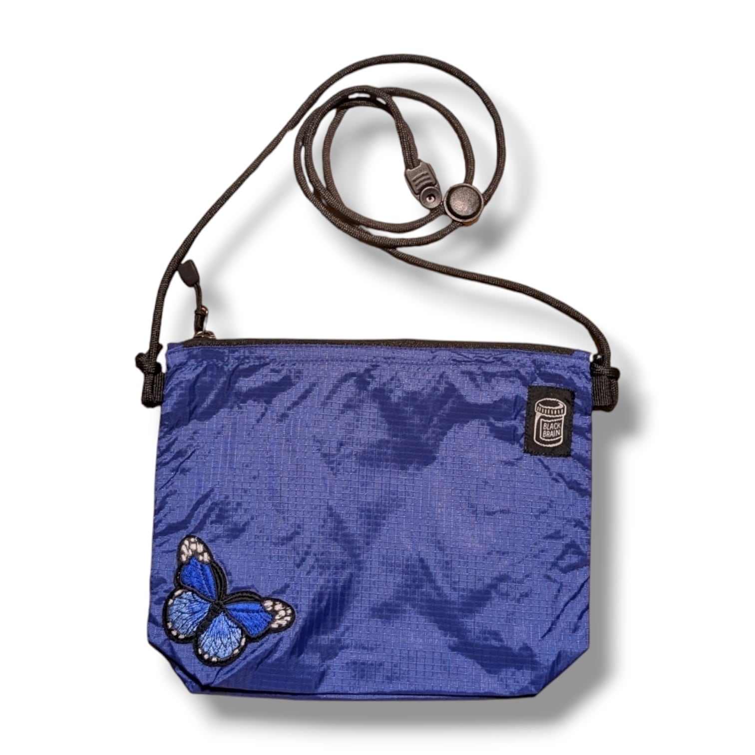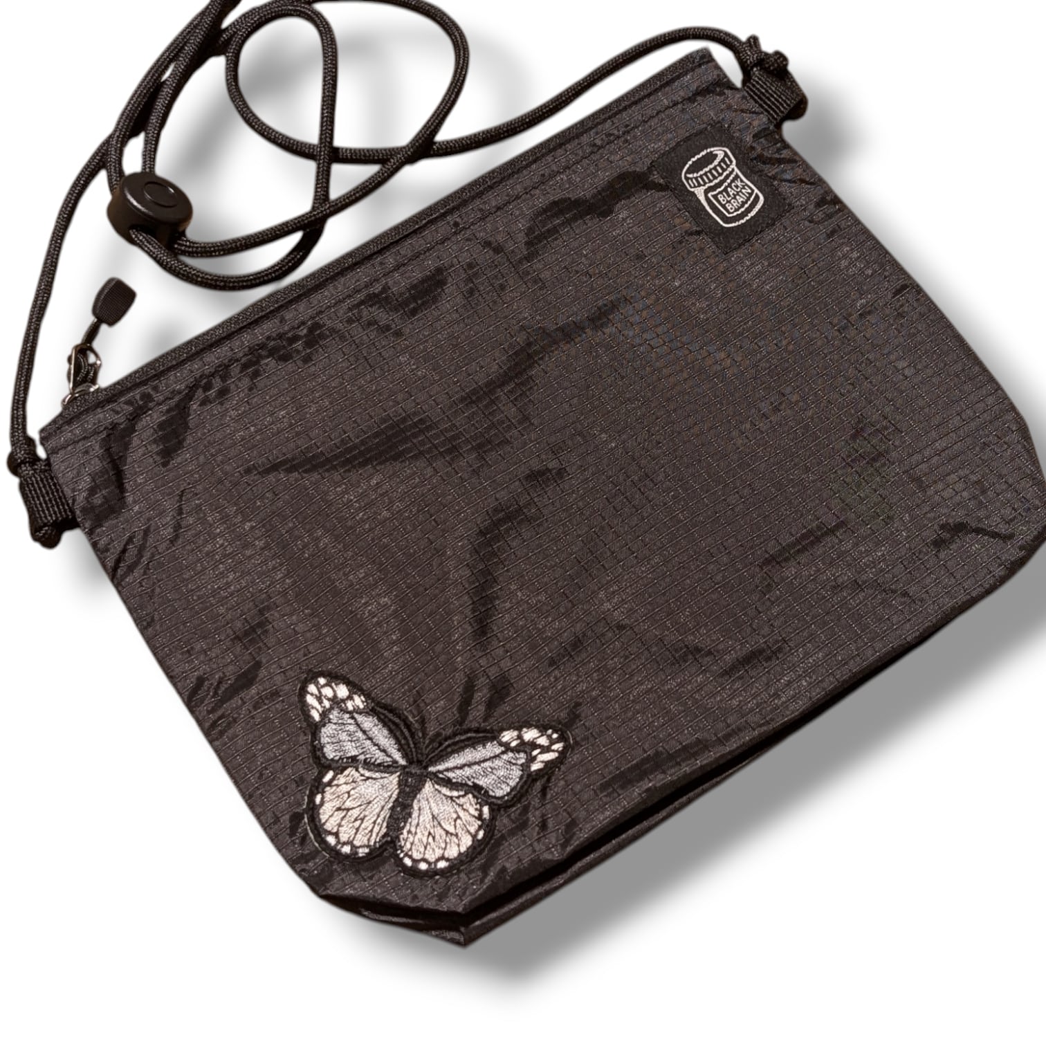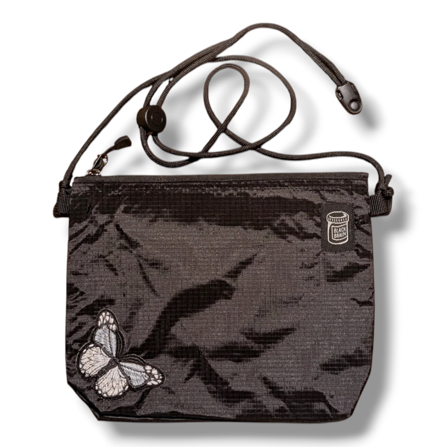 ミニですが、5cmのマチがあるので意外に何でも入るサコッシュです。内部には便利なポケットも装備。ショルダーコードはワンタッチで長さが調整できるアジャスターボタン付。ジッパーは開きやすいタブ付。前面にBLACK BRAINピルボトルロゴと、バタフライの刺繍を配置。カラーは3色からお選びください。