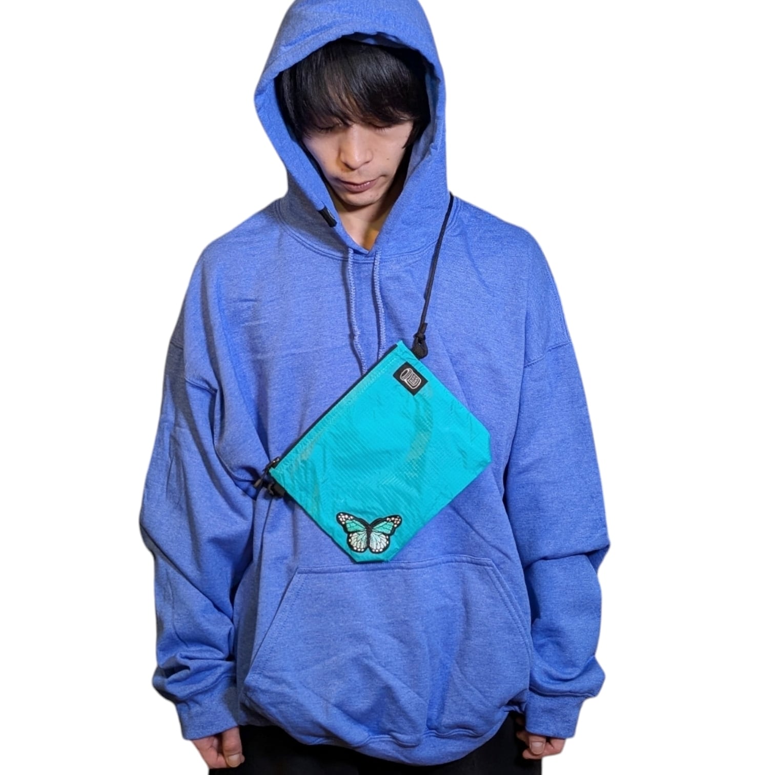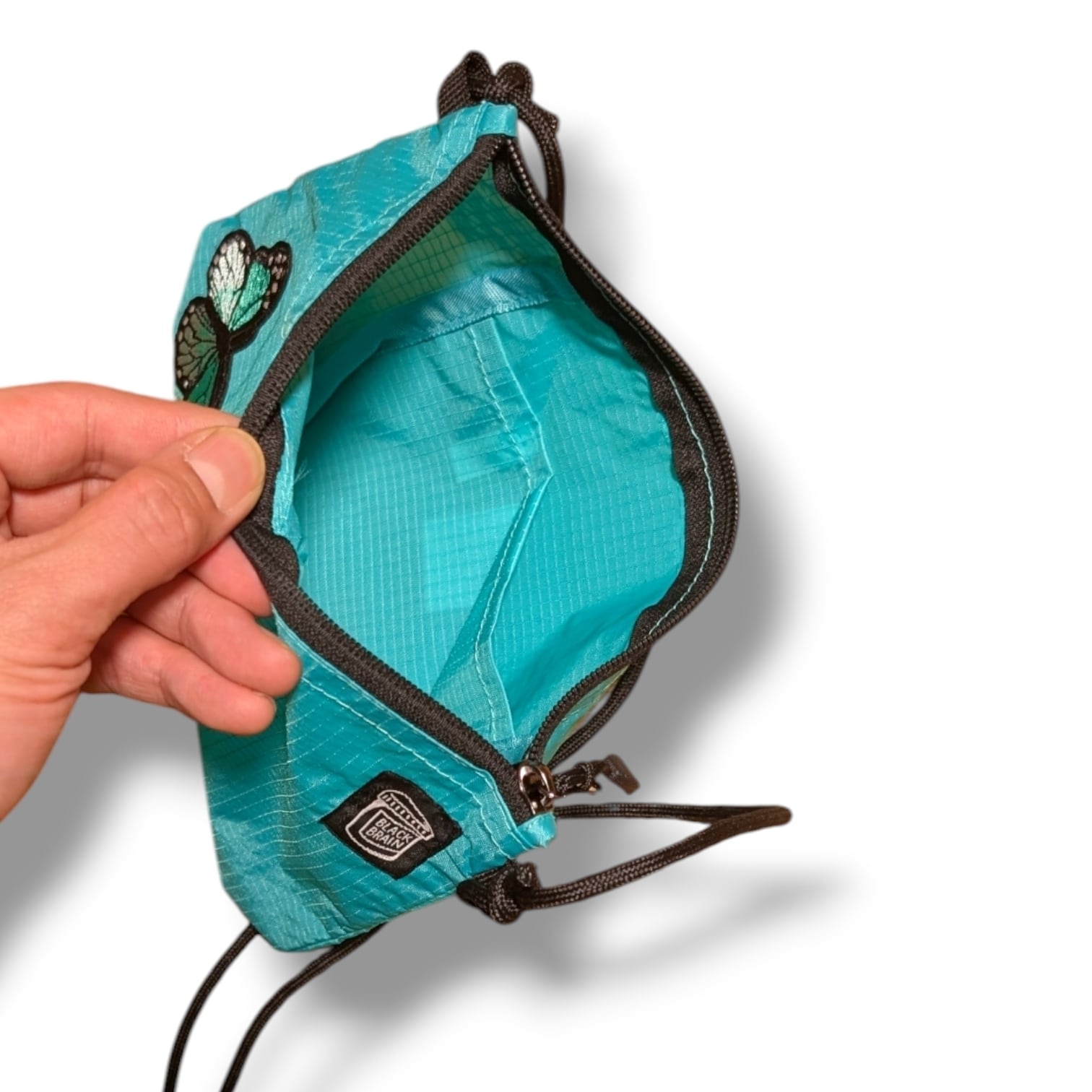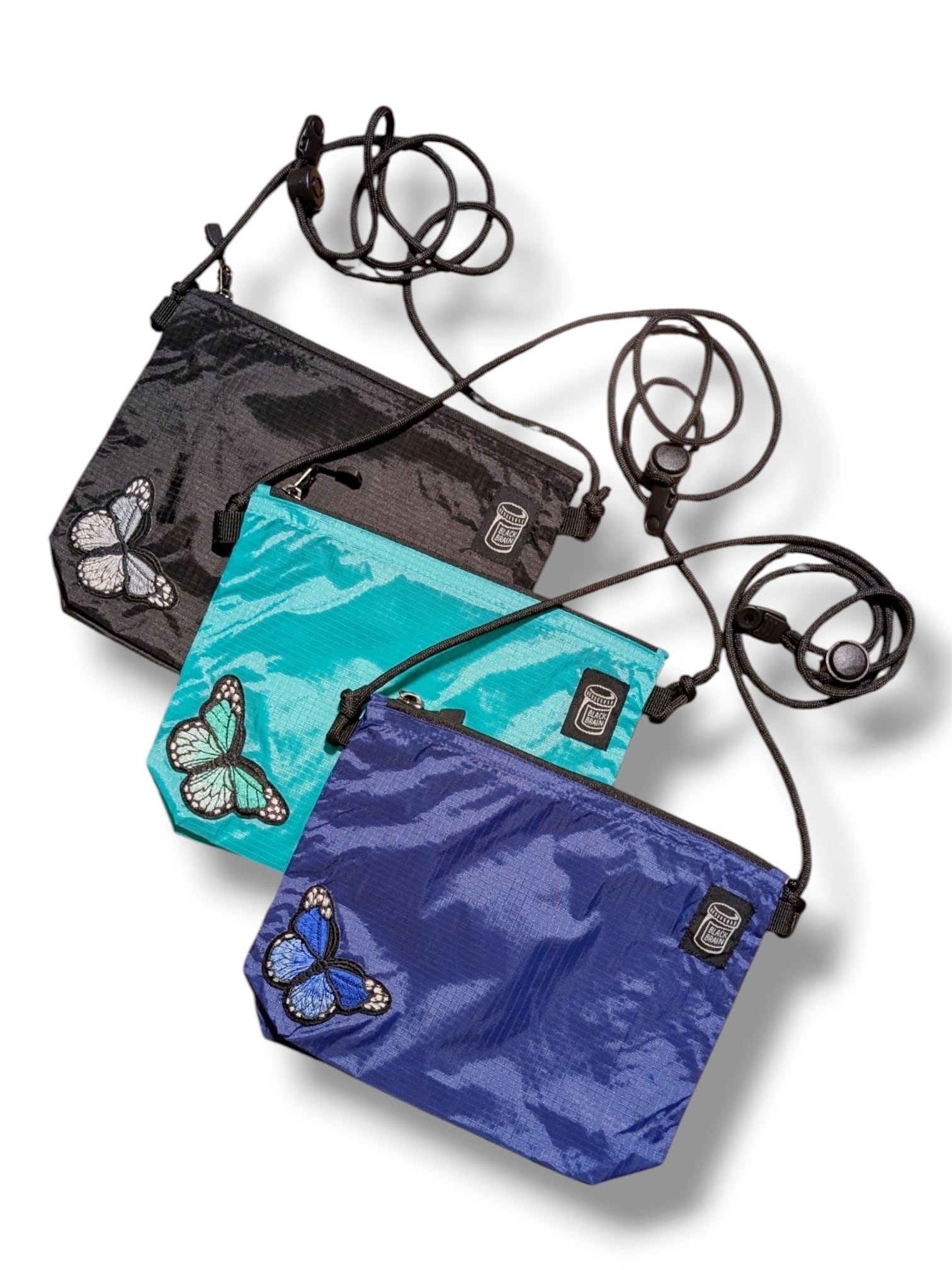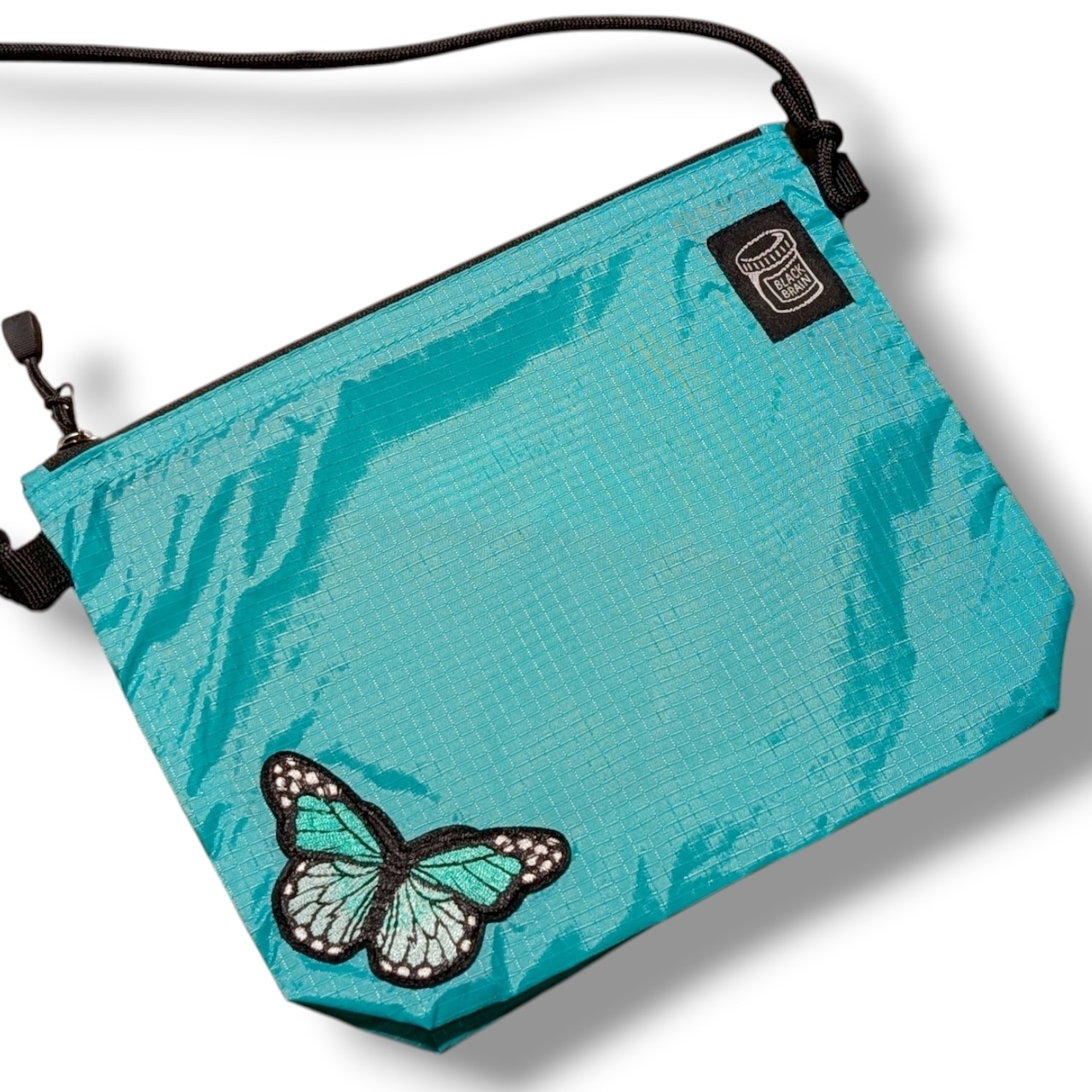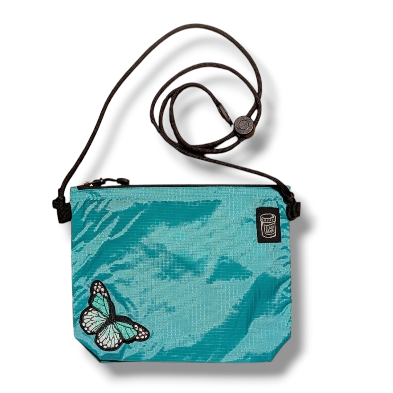 ミニですが、5cmのマチがあるので意外に何でも入るサコッシュです。内部には便利なポケットも装備。ショルダーコードはワンタッチで長さが調整できるアジャスターボタン付。ジッパーは開きやすいタブ付。前面にBLACK BRAINピルボトルロゴと、バタフライの刺繍を配置。カラーは3色からお選びください。