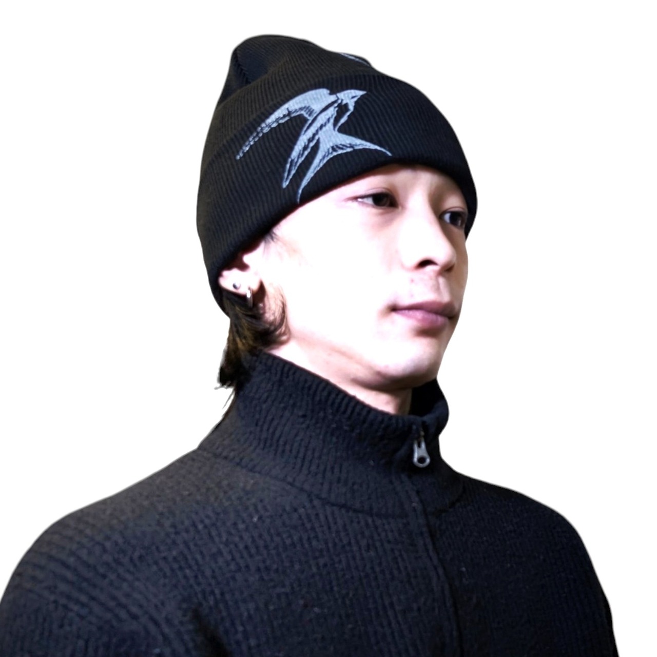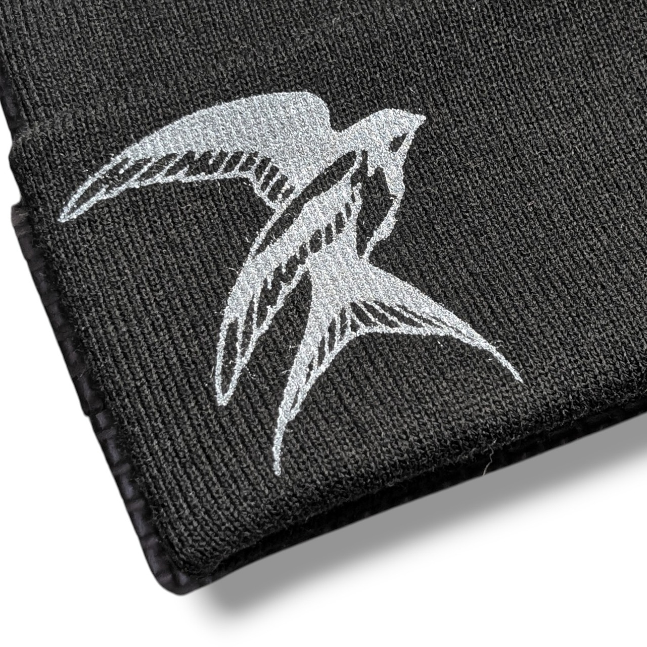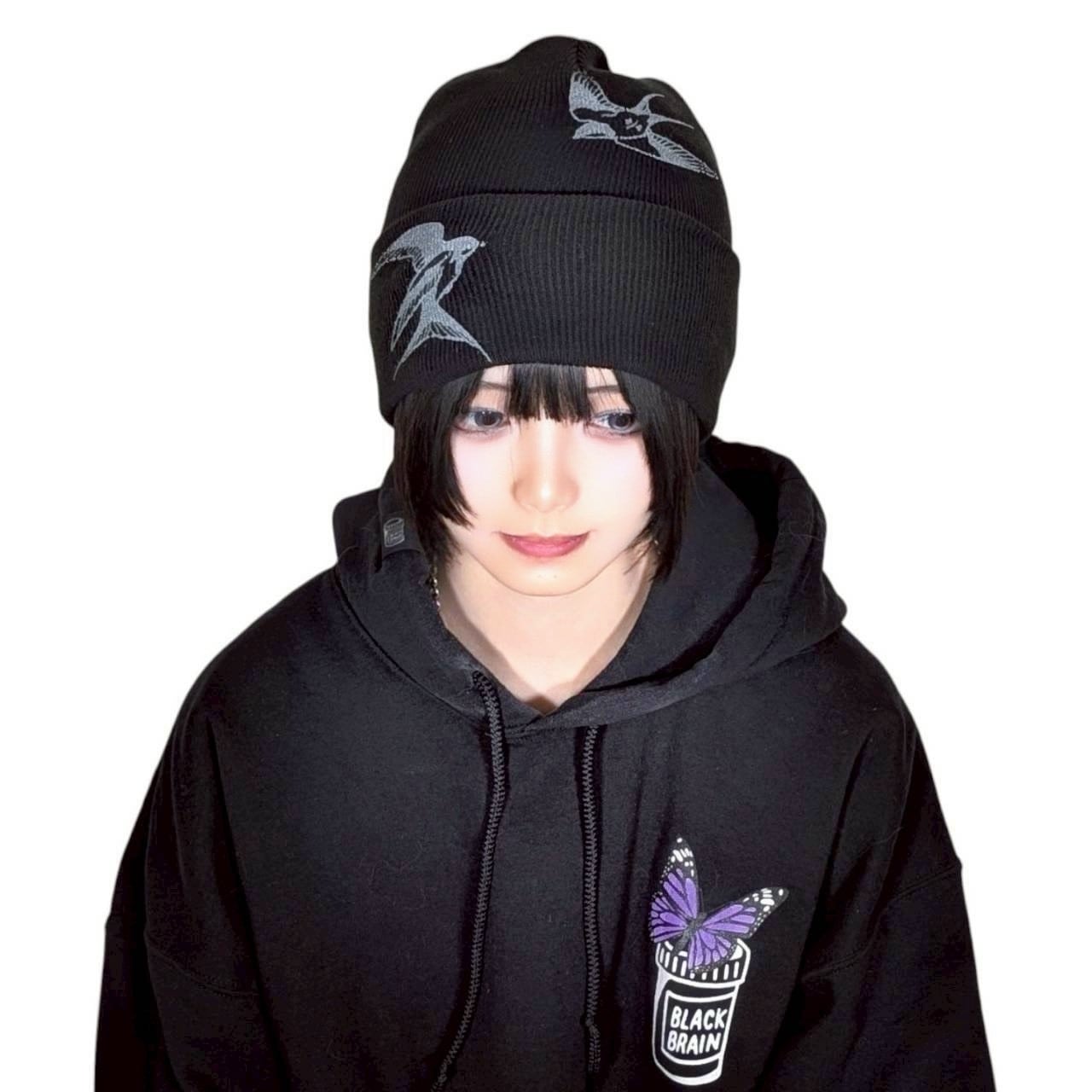 ビーニーです。表にも裏にもツバメを手作業でシルクスクリーンしています。