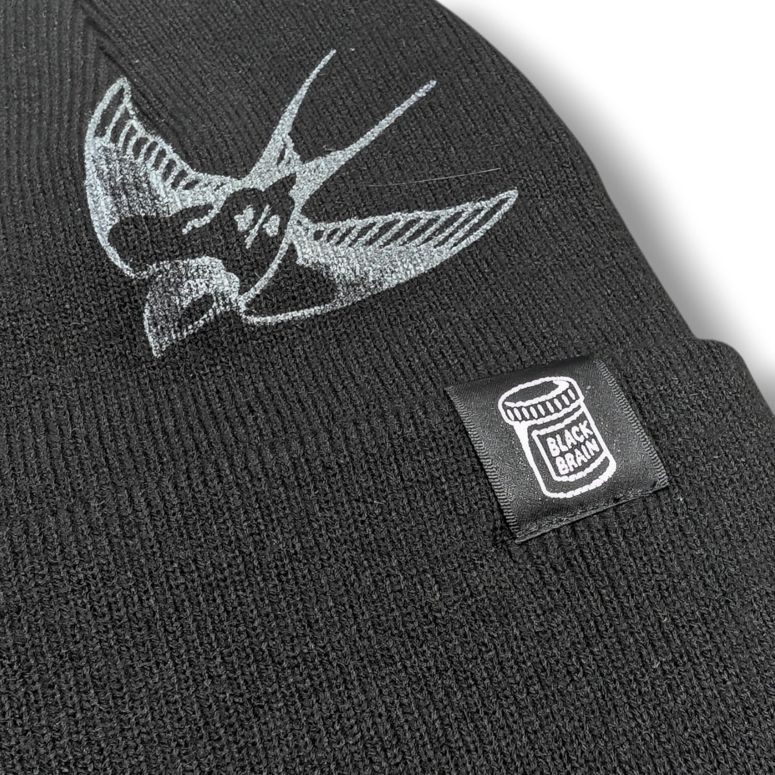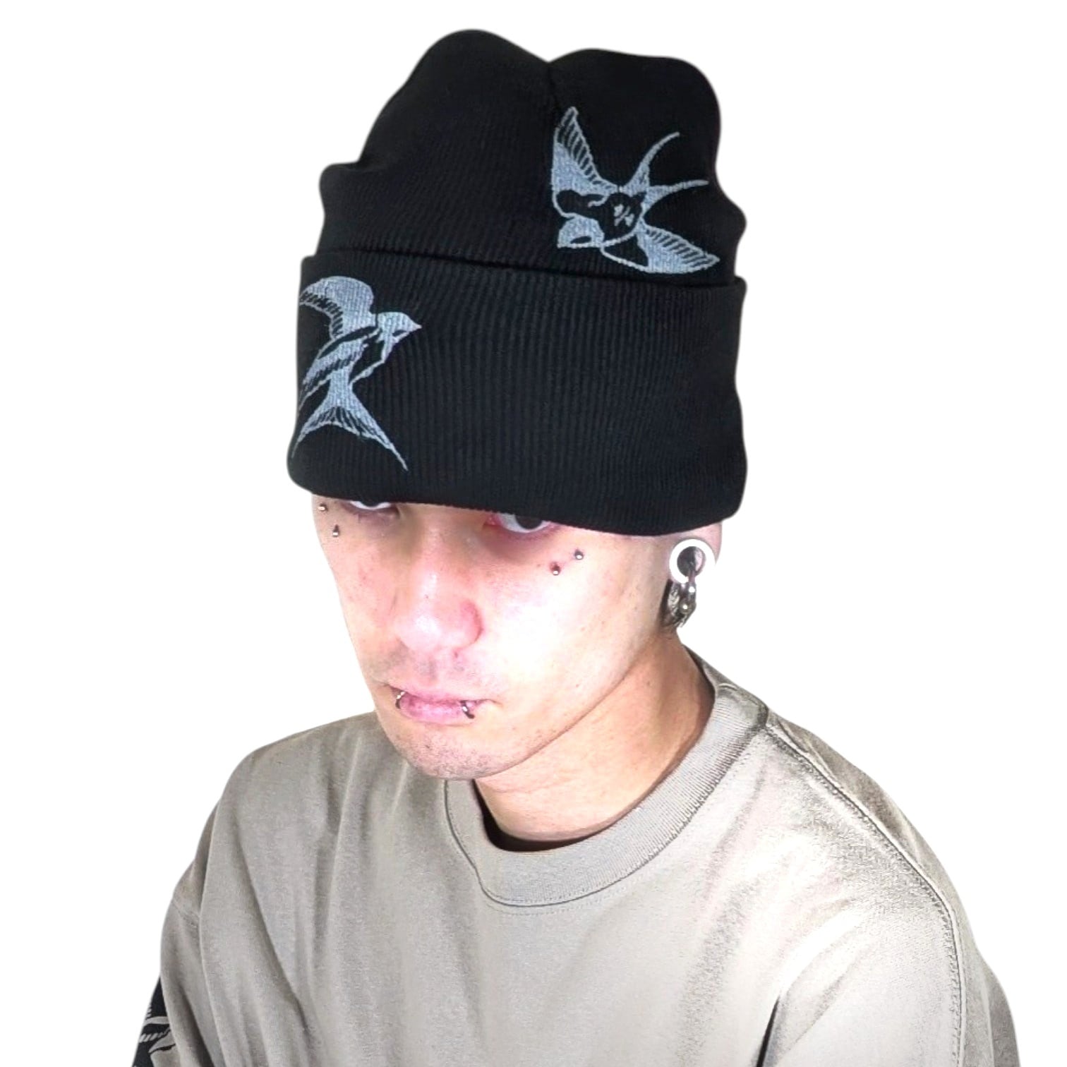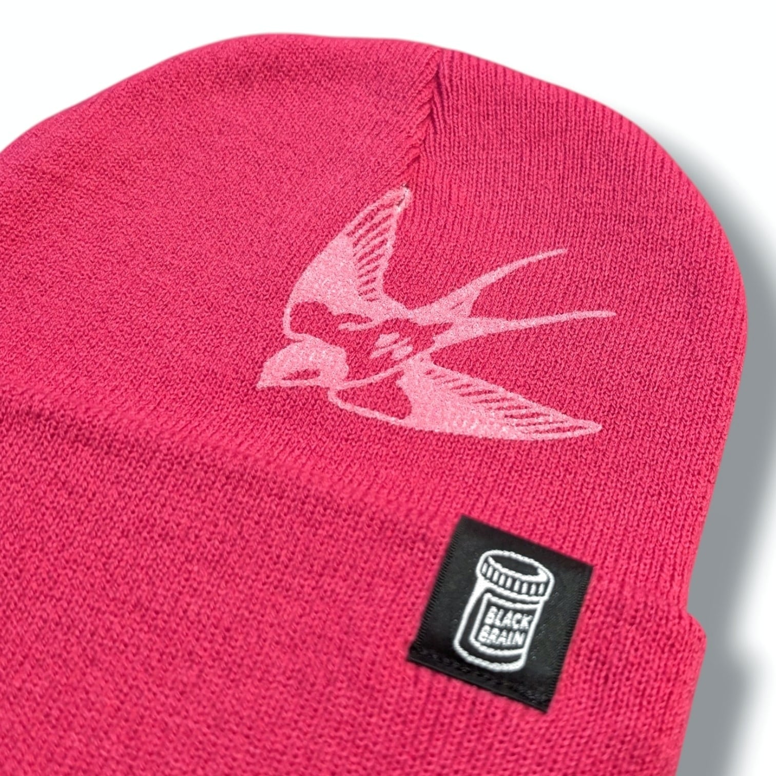 ビーニーです。表にも裏にもツバメを手作業でシルクスクリーンしています。