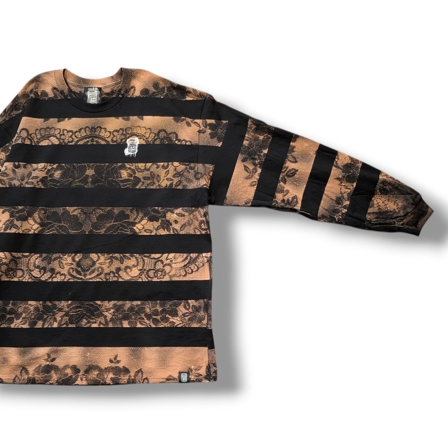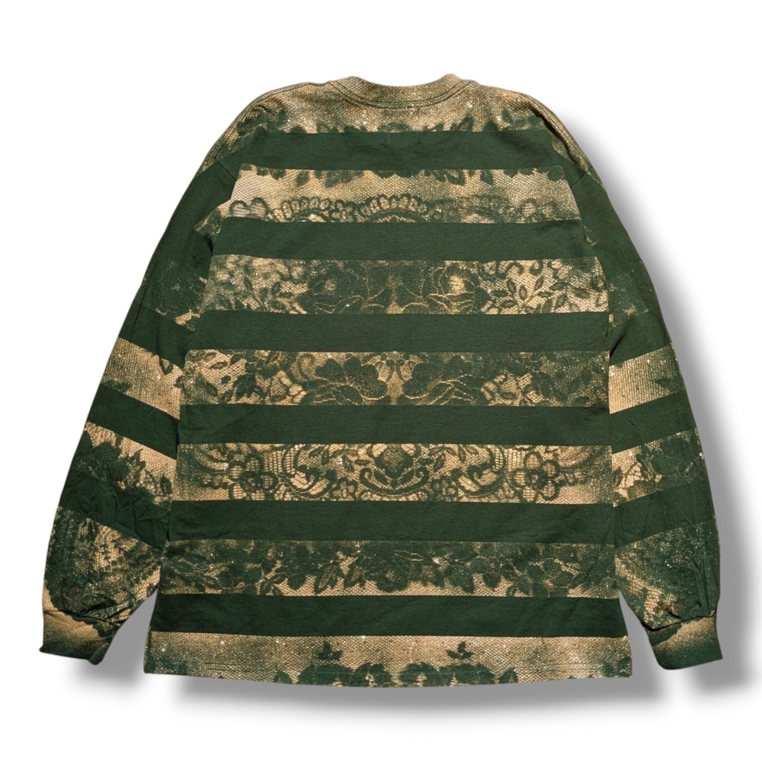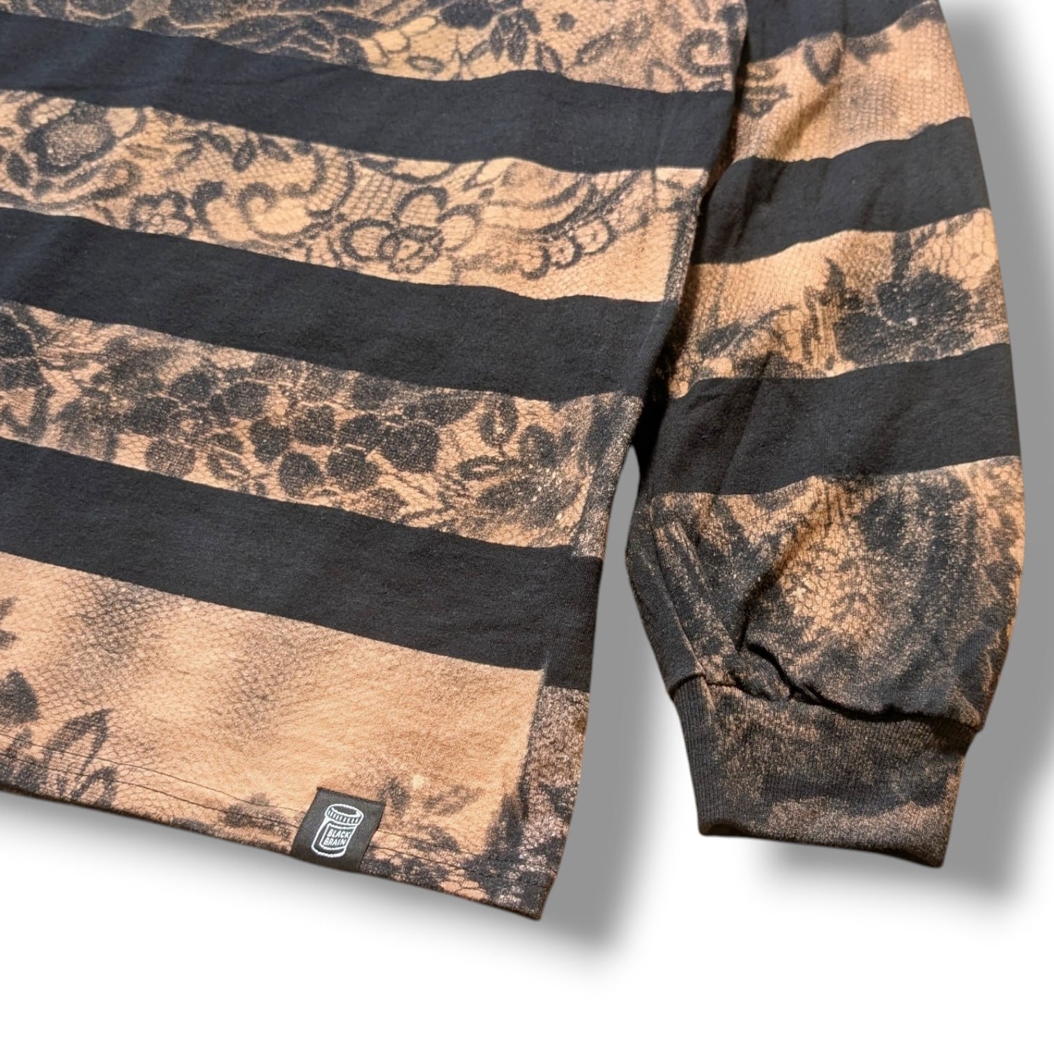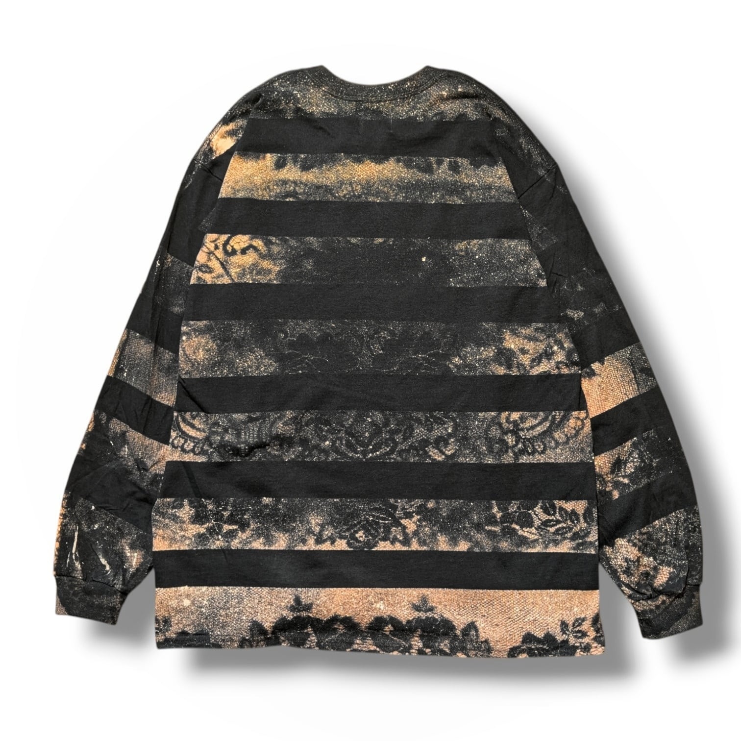 最近カスタムウェア界隈ではレースとブリーチ(漂白剤)を使った服の流行がありますが、それをそのままやっても面白くないかなと思ったのでボーダーと生み出せました。どこでも見たことがない雰囲気のある1枚になっていると思います。