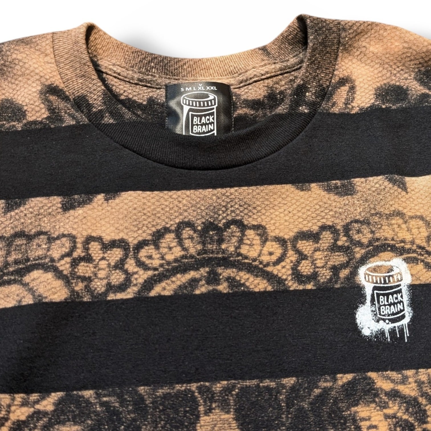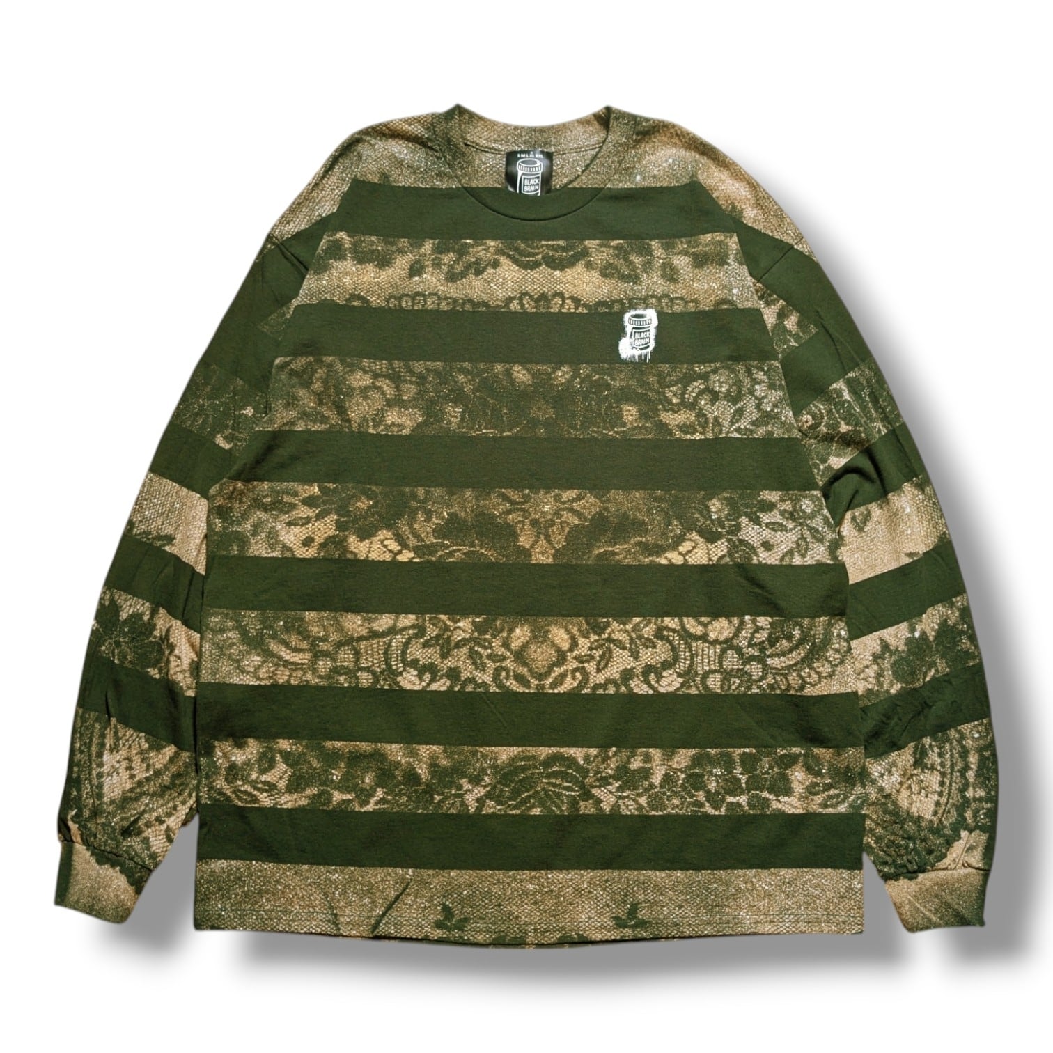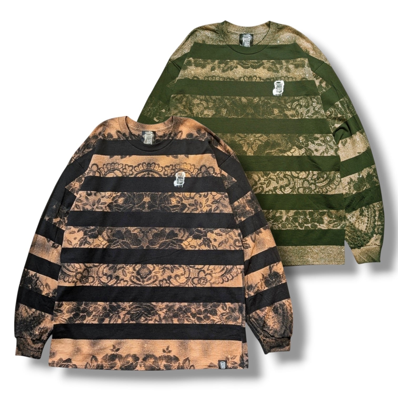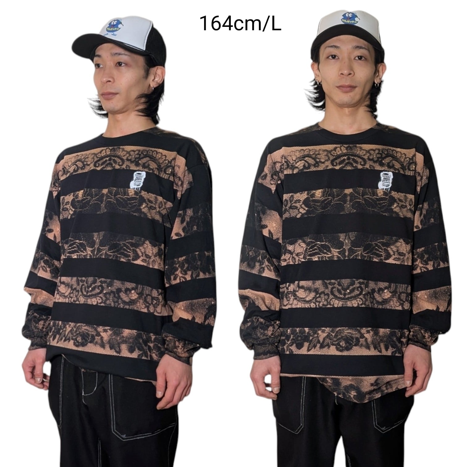 最近カスタムウェア界隈ではレースとブリーチ(漂白剤)を使った服の流行がありますが、それをそのままやっても面白くないかなと思ったのでボーダーと生み出せました。どこでも見たことがない雰囲気のある1枚になっていると思います。