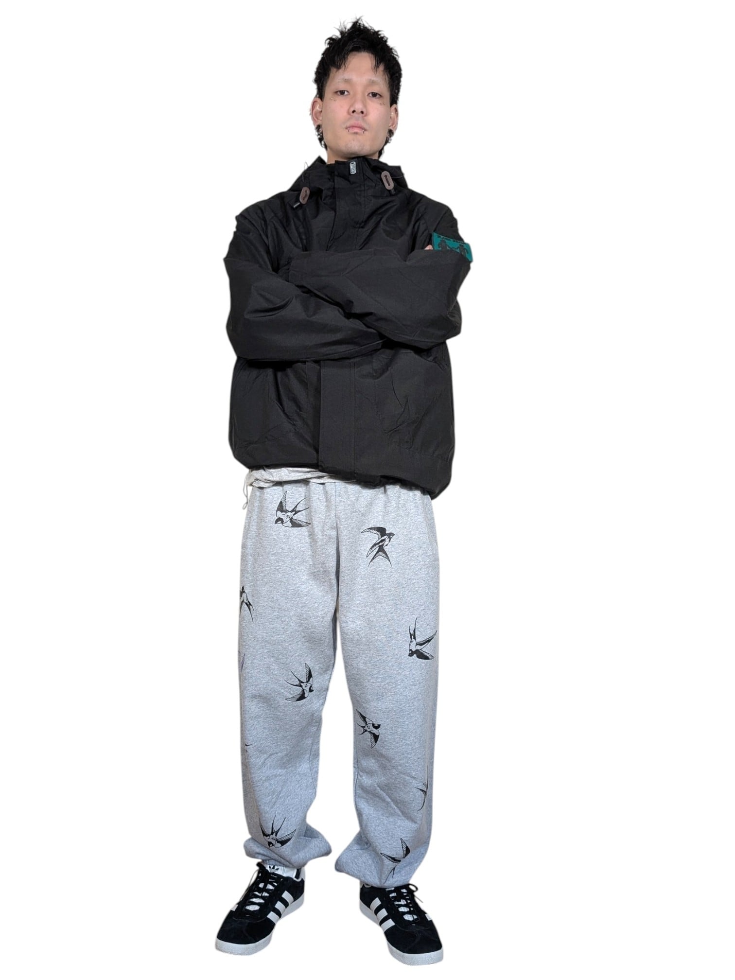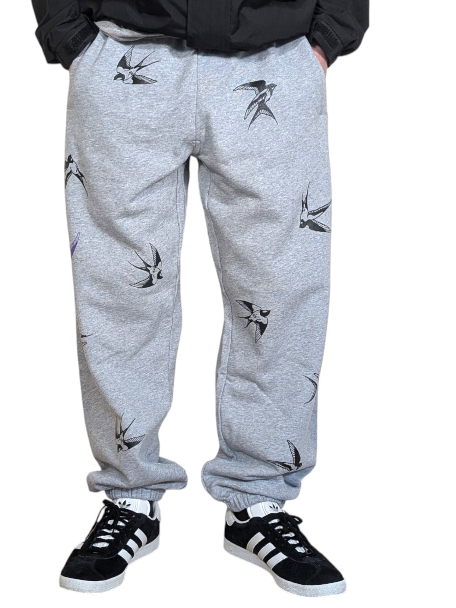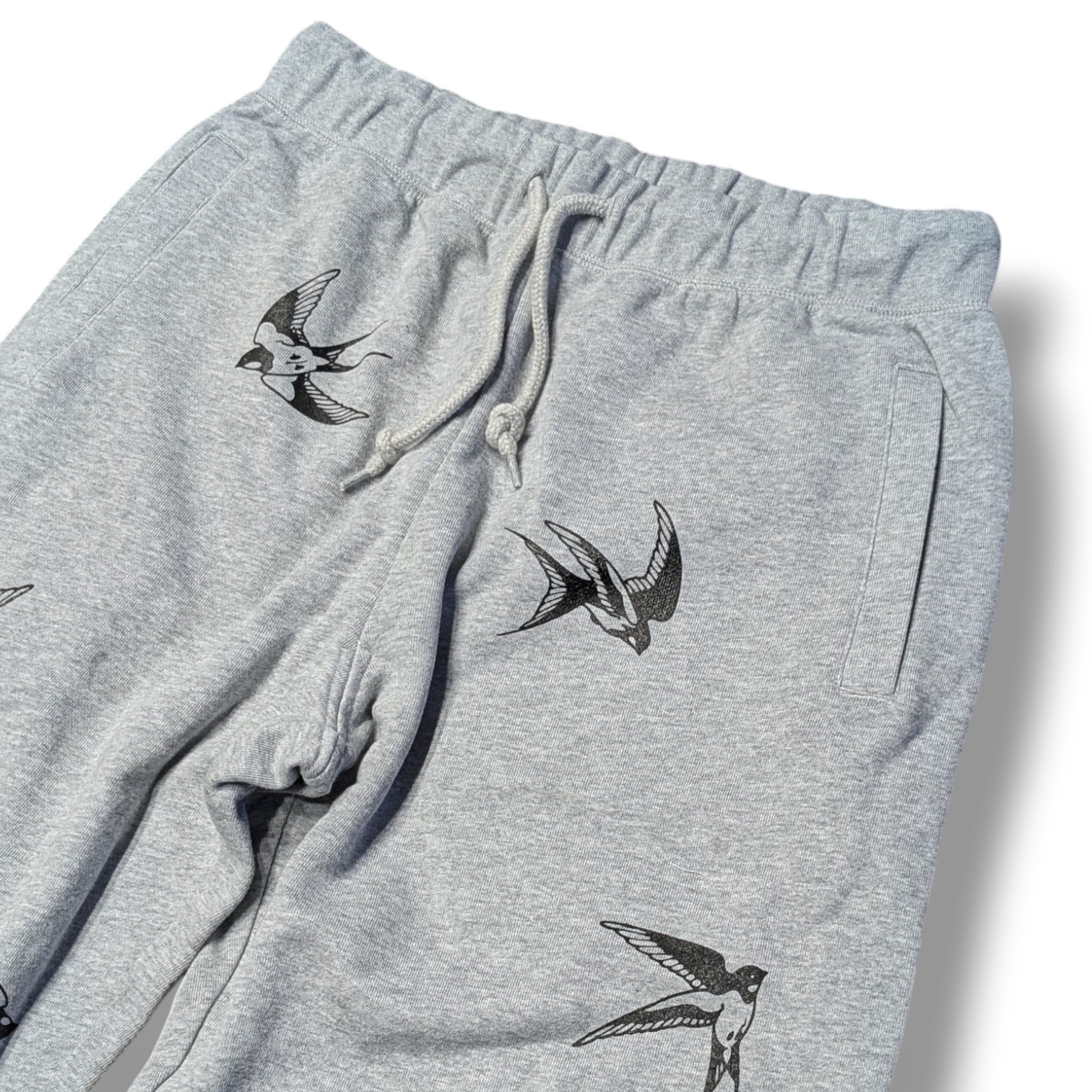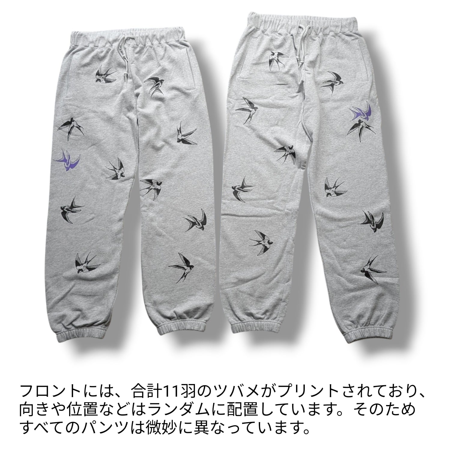 前面と後面に合計14羽のツバメがプリントされたジョガーパンツです。なんとパンツ一枚につき“14回シルクスクリーンプリントしています”。手間かかりすぎです。でもカワイイです。ツバメは前面に11羽、後面に3羽プリントされていますが、位置や角度はランダムにプリントされているためまったく同じパンツは存在しません。
