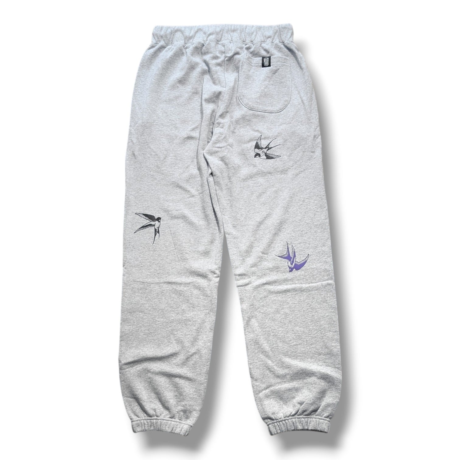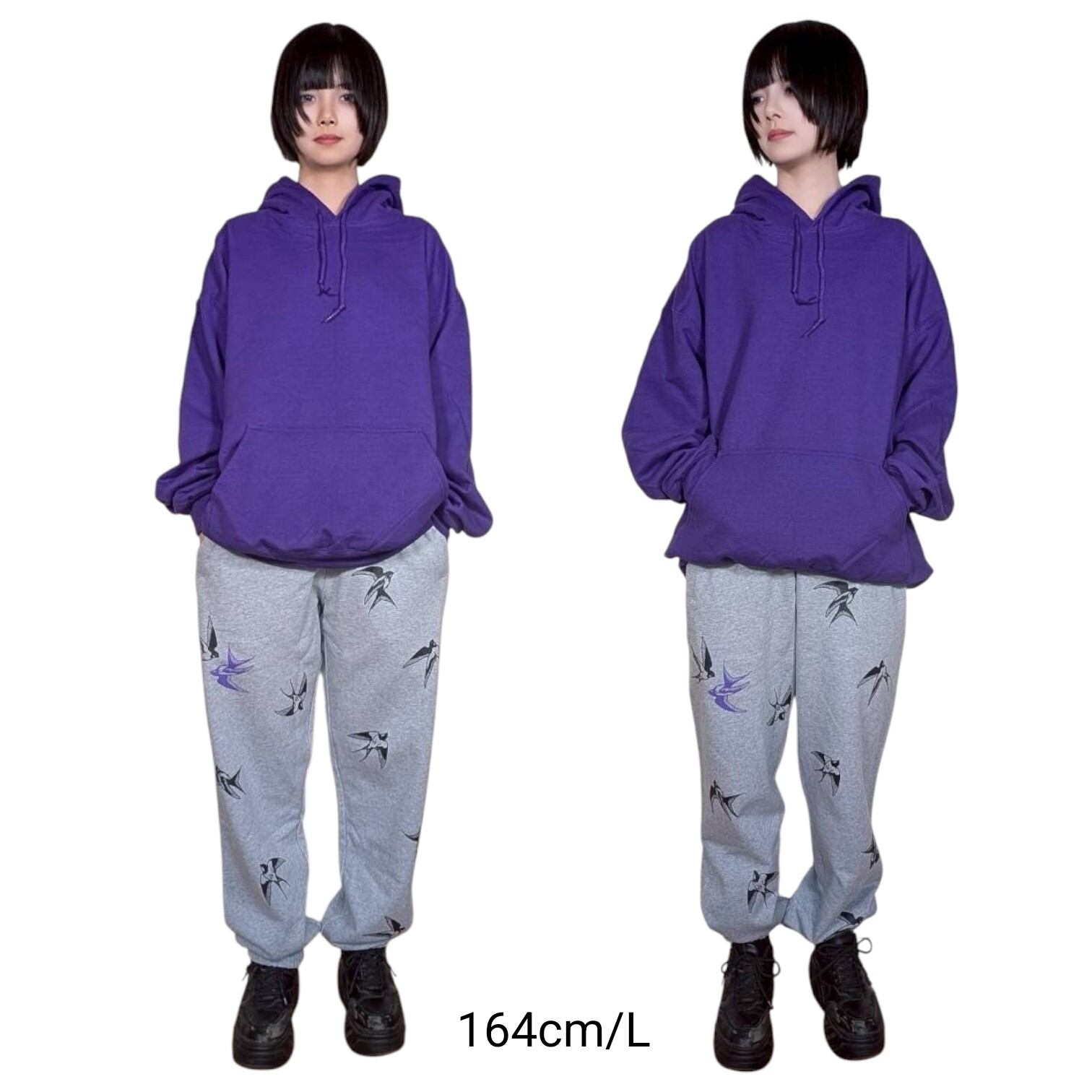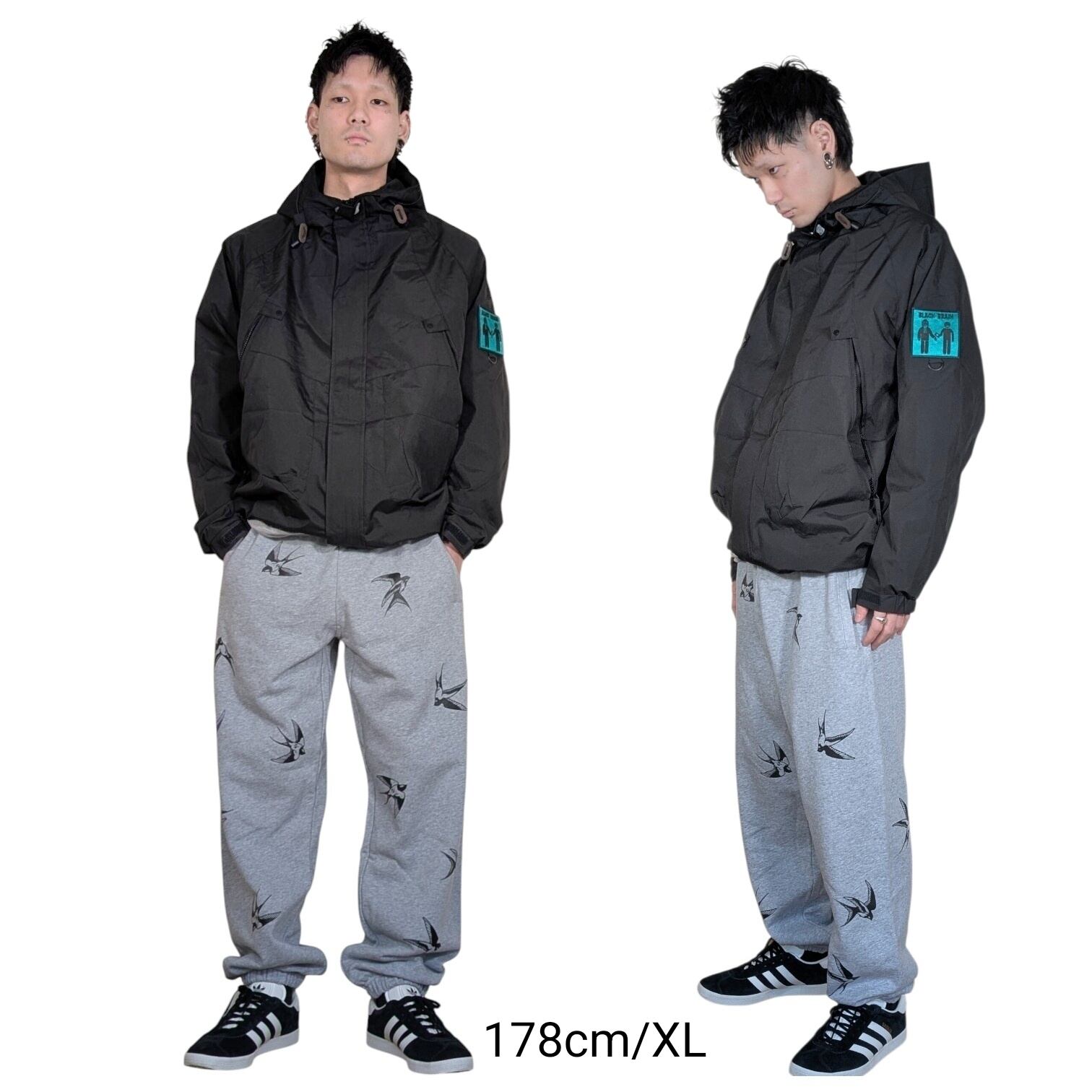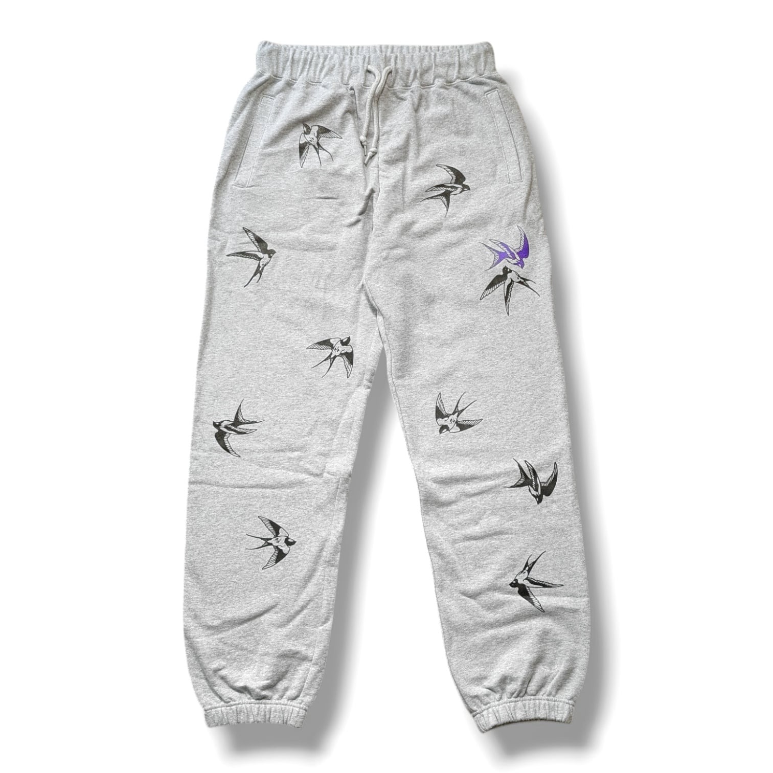 前面と後面に合計14羽のツバメがプリントされたジョガーパンツです。なんとパンツ一枚につき“14回シルクスクリーンプリントしています”。手間かかりすぎです。でもカワイイです。ツバメは前面に11羽、後面に3羽プリントされていますが、位置や角度はランダムにプリントされているためまったく同じパンツは存在しません。
